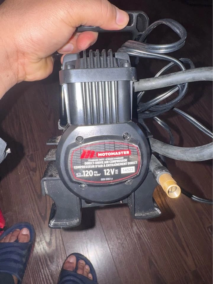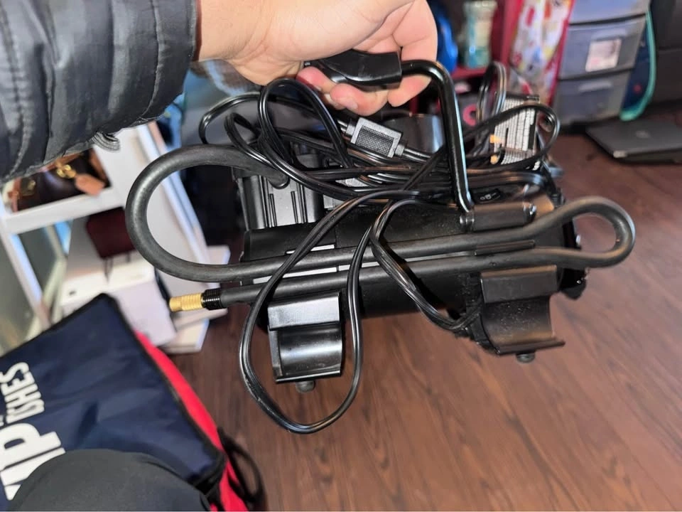 Features a digital PSI display and auto shut-off when the target pressure is reached. Includes a bright LED flashlight for night or emergency use. It has a compact, portable design and a 12V car plug. Suitable for car tires, bike tires, sports balls, and more. Included: Air compressor unit, power cable, and air hose.
