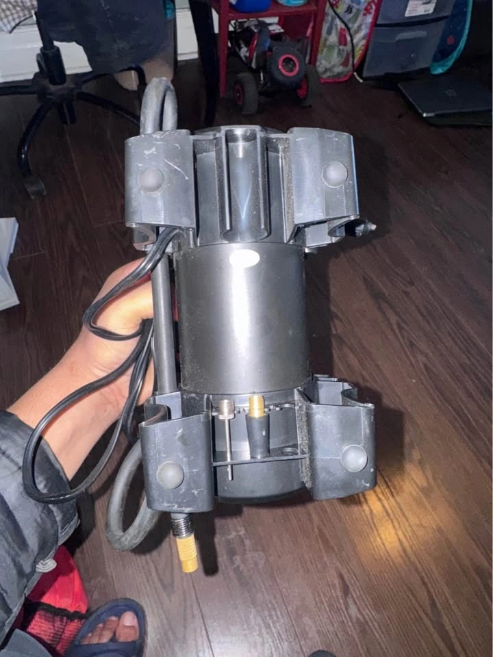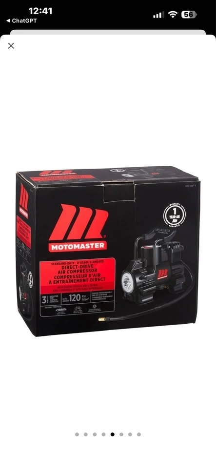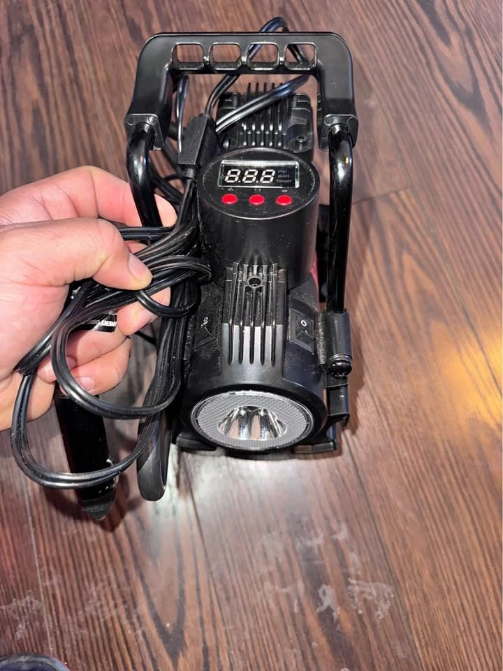 Features a digital PSI display and auto shut-off when the target pressure is reached. Includes a bright LED flashlight for night or emergency use. It has a compact, portable design and a 12V car plug. Suitable for car tires, bike tires, sports balls, and more. Included: Air compressor unit, power cable, and air hose.