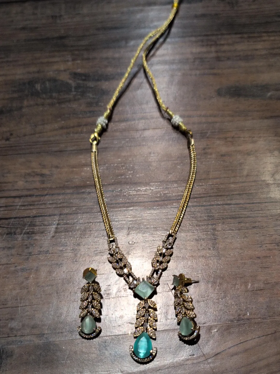 This is a gold-tone necklace and earring set. The set features faux green gemstones and intricate detailing. It's a lovely accessory for formal occasions.