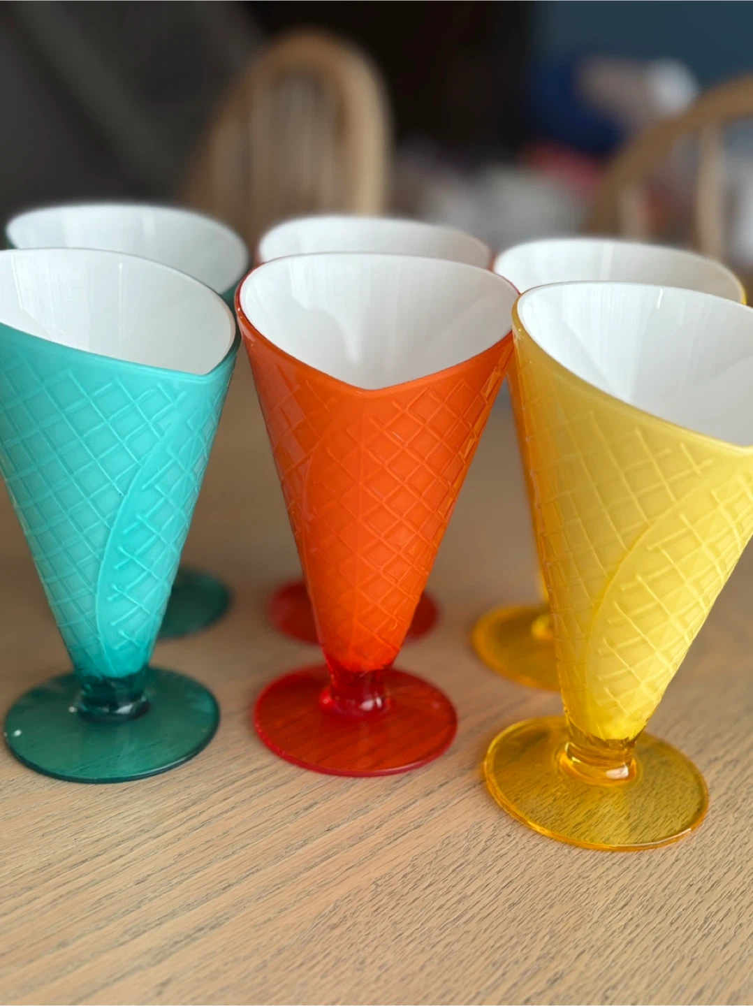 A fun set of six dessert plastic designed to look like ice cream cones. These colourful cones come in aqua, orange, and yellow hues with matching coloured bases. They're great for serving ice cream, sundaes, or other sweet treats! Perfect for adding a playful touch to any dessert.