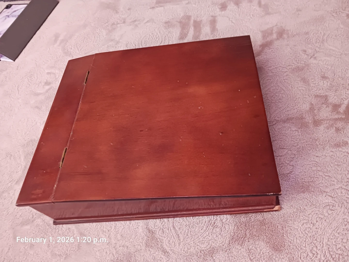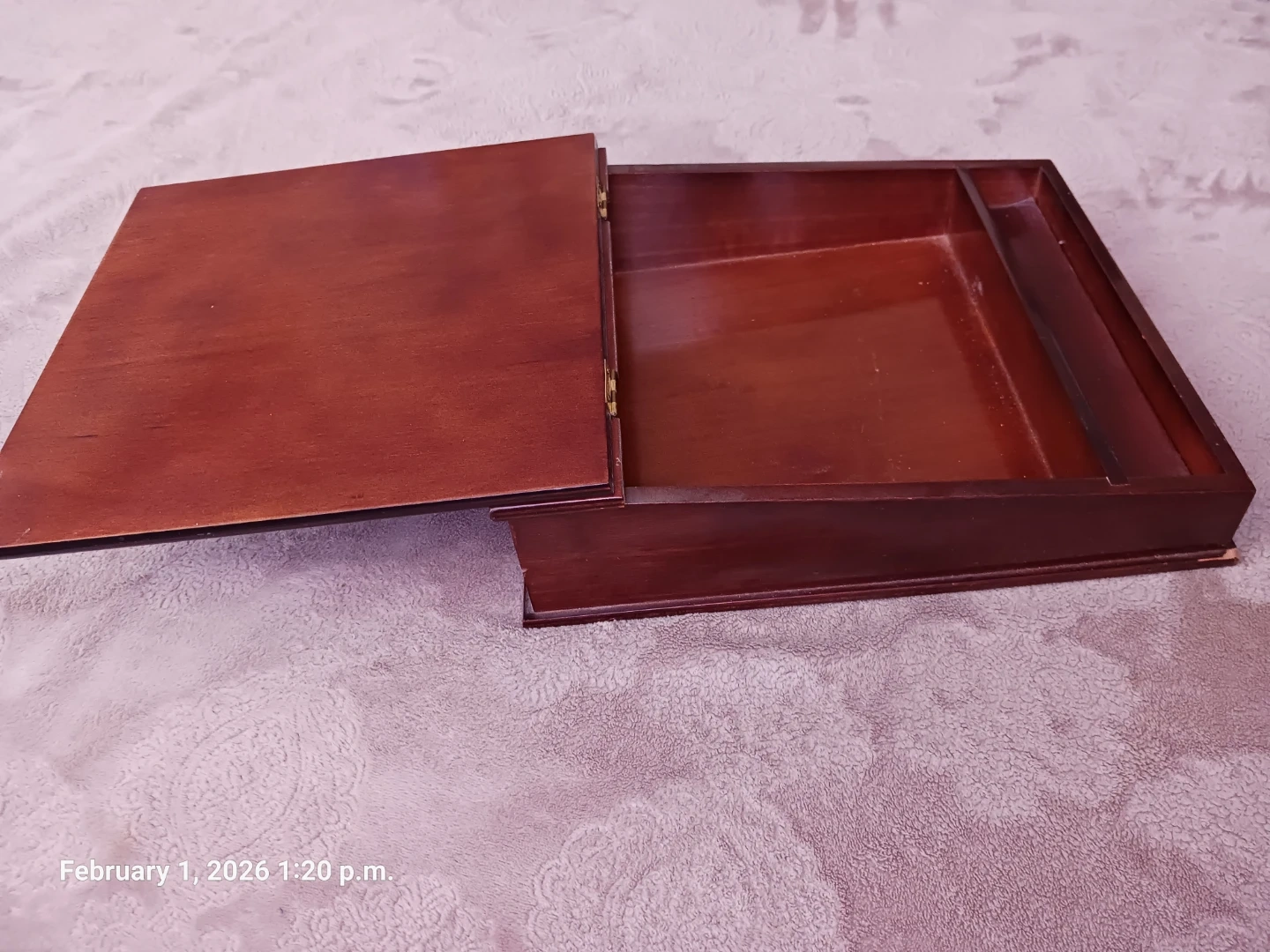 This is a wooden storage box with a hinged lid. It's suitable for storing various small items. The wood has a rich, dark stain.