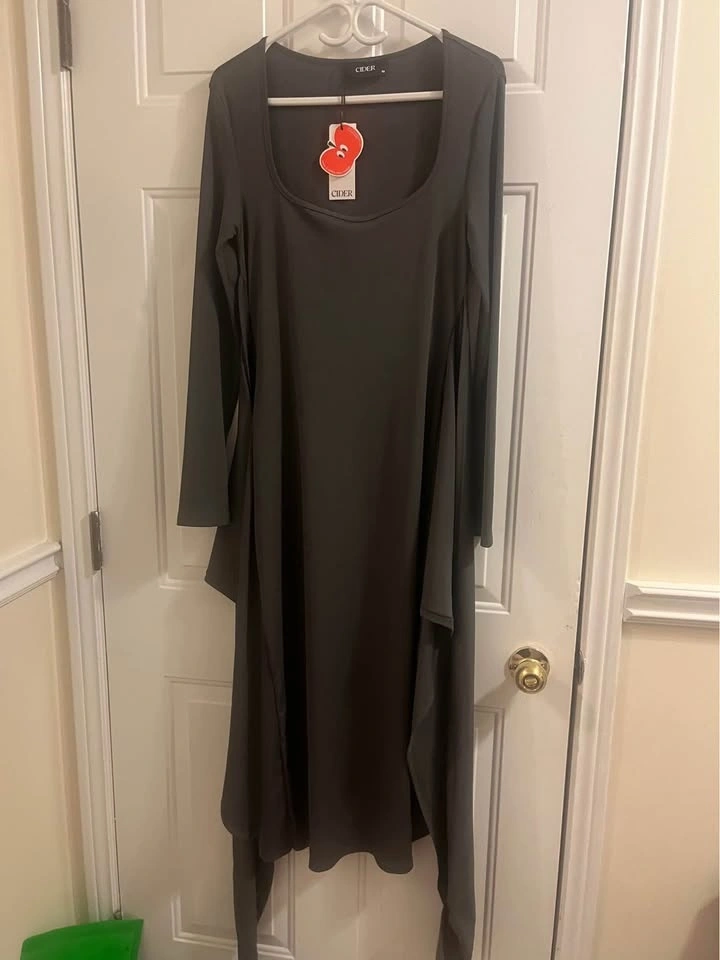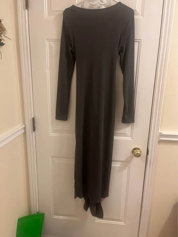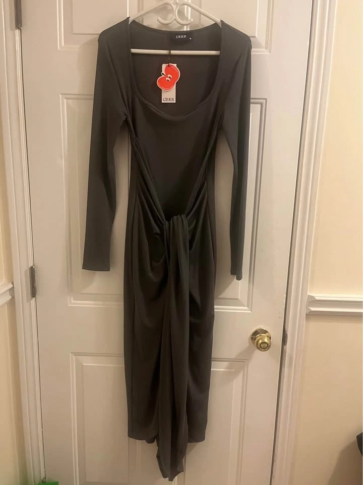 Cute CIDER dress, dark gray long sleeve with a square neck. Has a cool knot detail at the waist and a flowy midi length. Tags still on, size M.