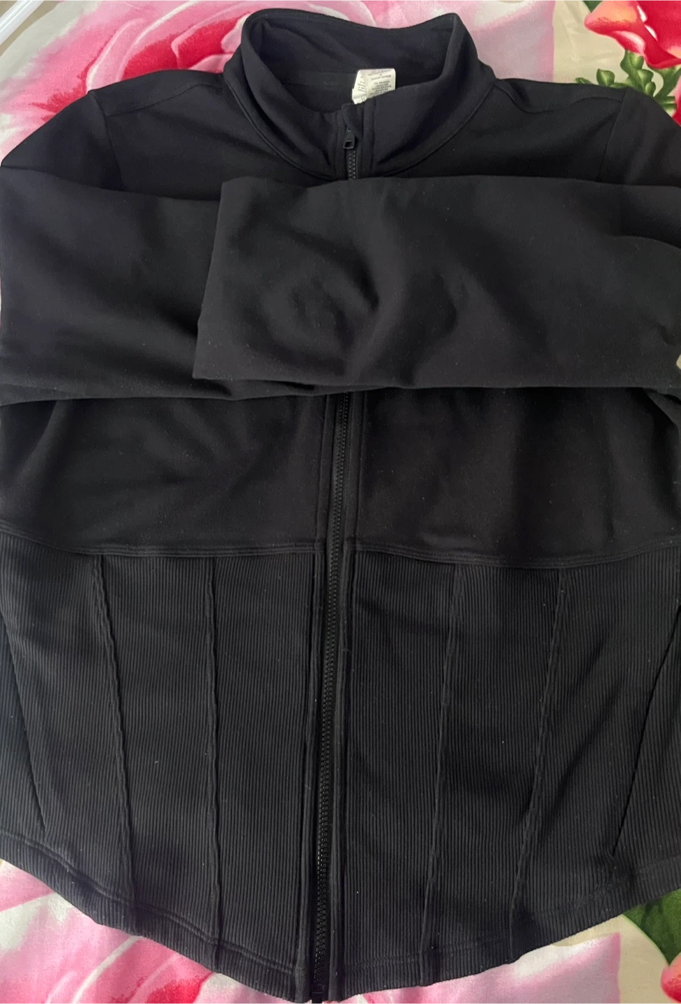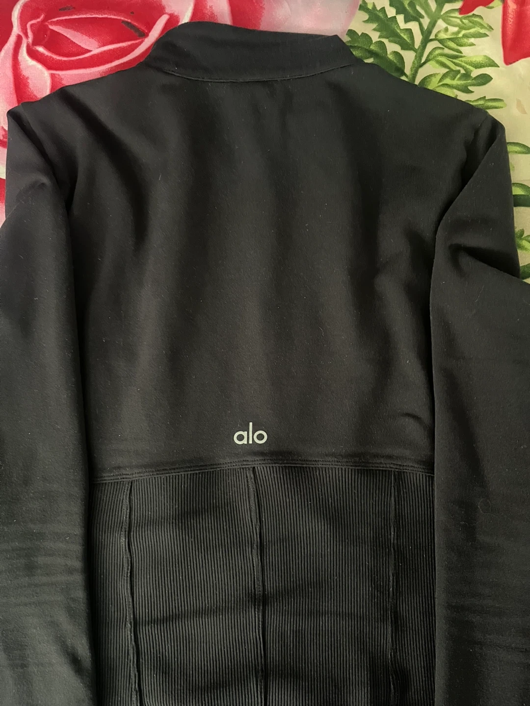 This Alo Yoga jacket is black and features a full zip closure. It has a ribbed detail at the waist and is made from a comfortable material. Perfect for your workout or casual wear!