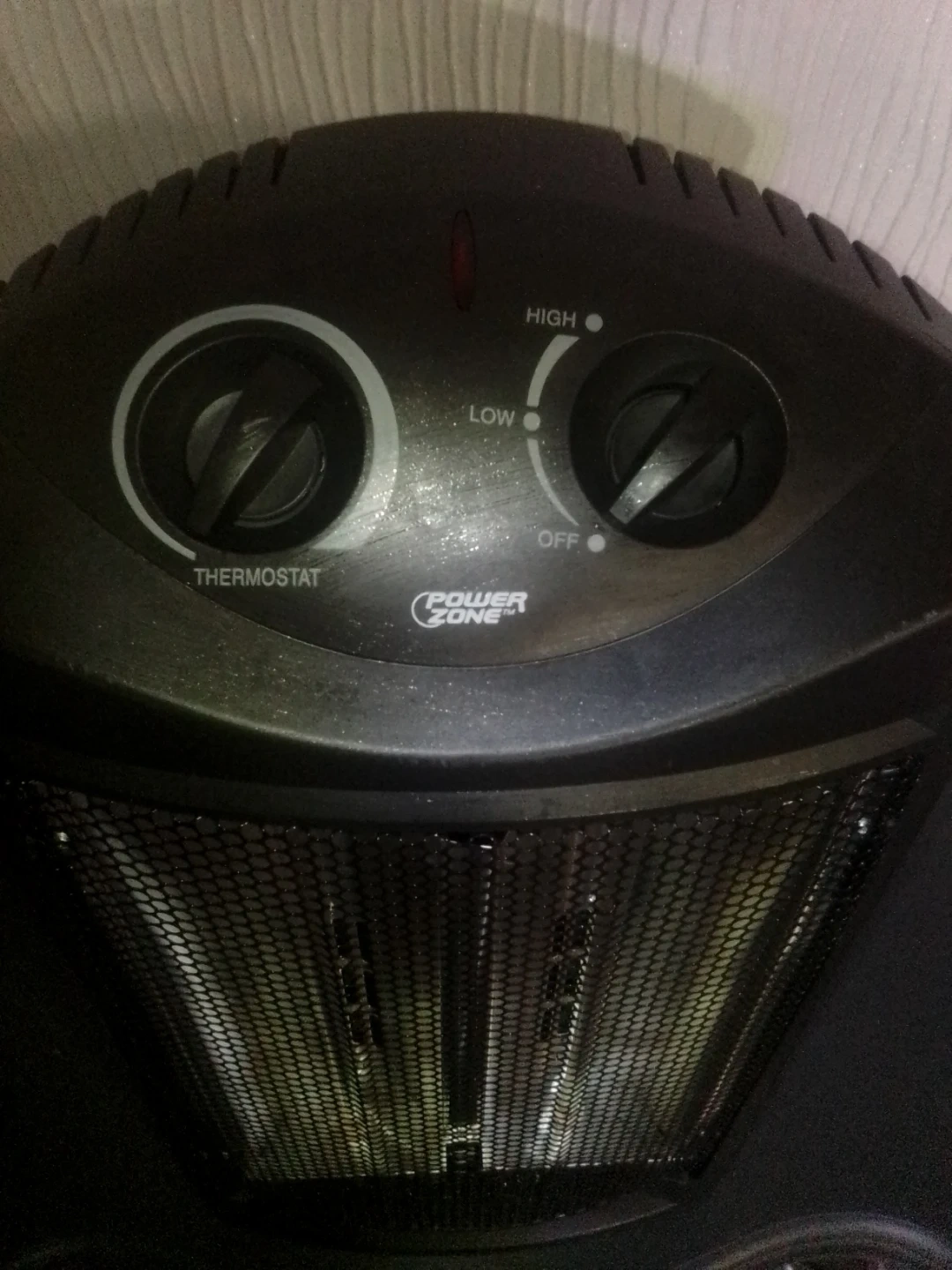 This is a Power Zone electric heater. It has two heat settings, low and high, and a thermostat control. It's black and has a mesh front with heating elements behind it. 24x12x7