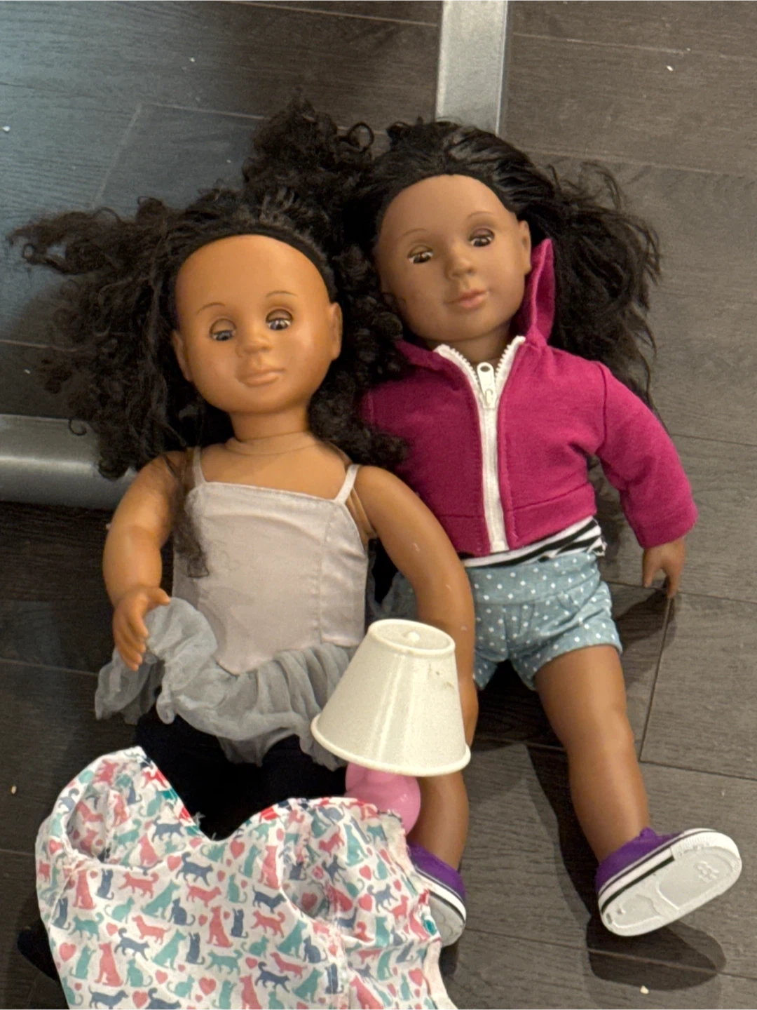 These two dolls are ready for playtime! One doll wears a pink zip-up hoodie and polka dot shorts, while the other has a ballet-inspired top. A cute outfit with a dog and cat print is also included. Great for imaginative fun! Just clearing up basement before renovations come with best offer