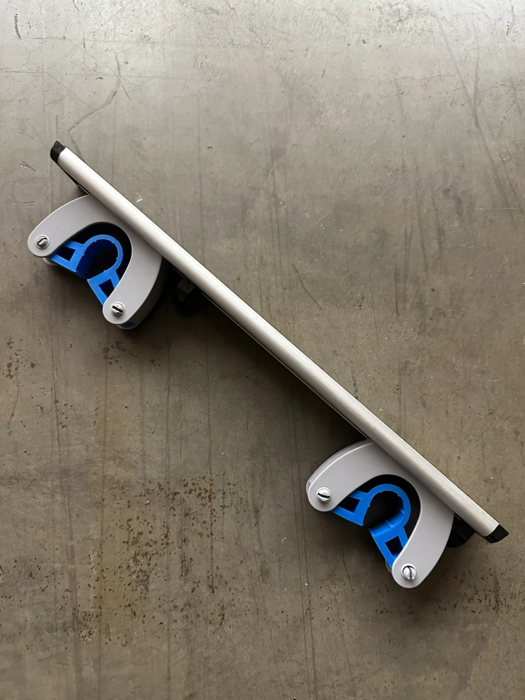 This wall mount holder keeps brooms and mops organized. It features two grippers made of durable plastic and a metal bar. It's perfect for tidy storage in a garage or utility room.