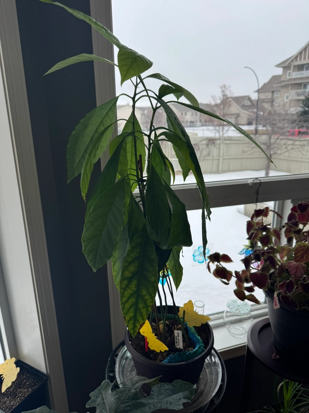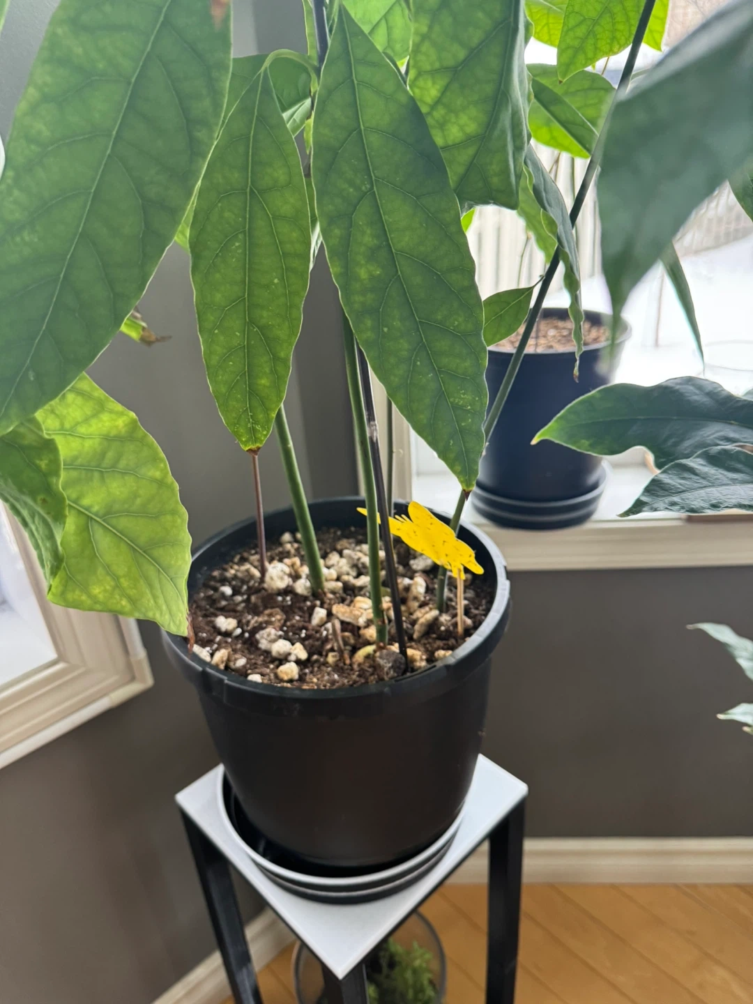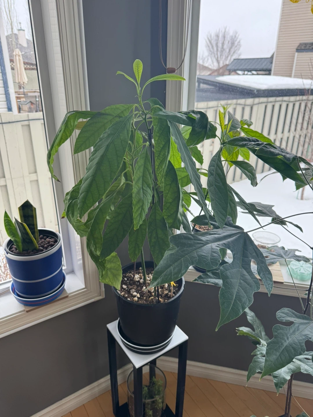 Healthy avocado plants with large green leaves in a black pot and 3D printed water tray. 24 inches high, 5 different species total in 1 pot. A lovely addition to any indoor space. Great for plant enthusiasts!