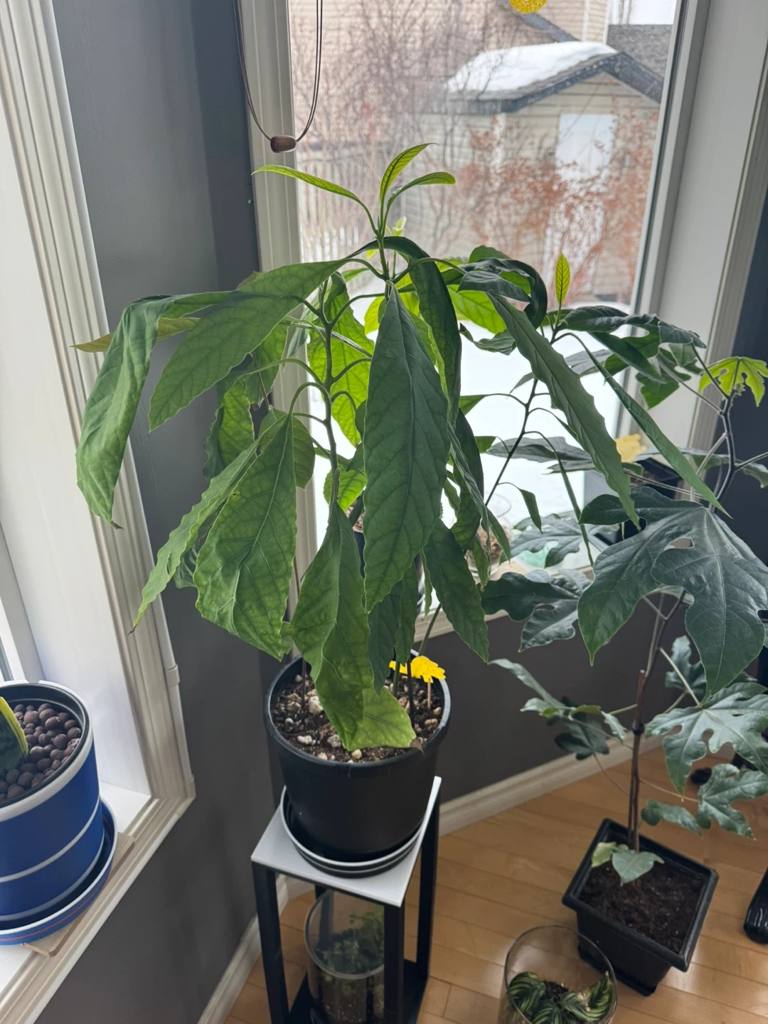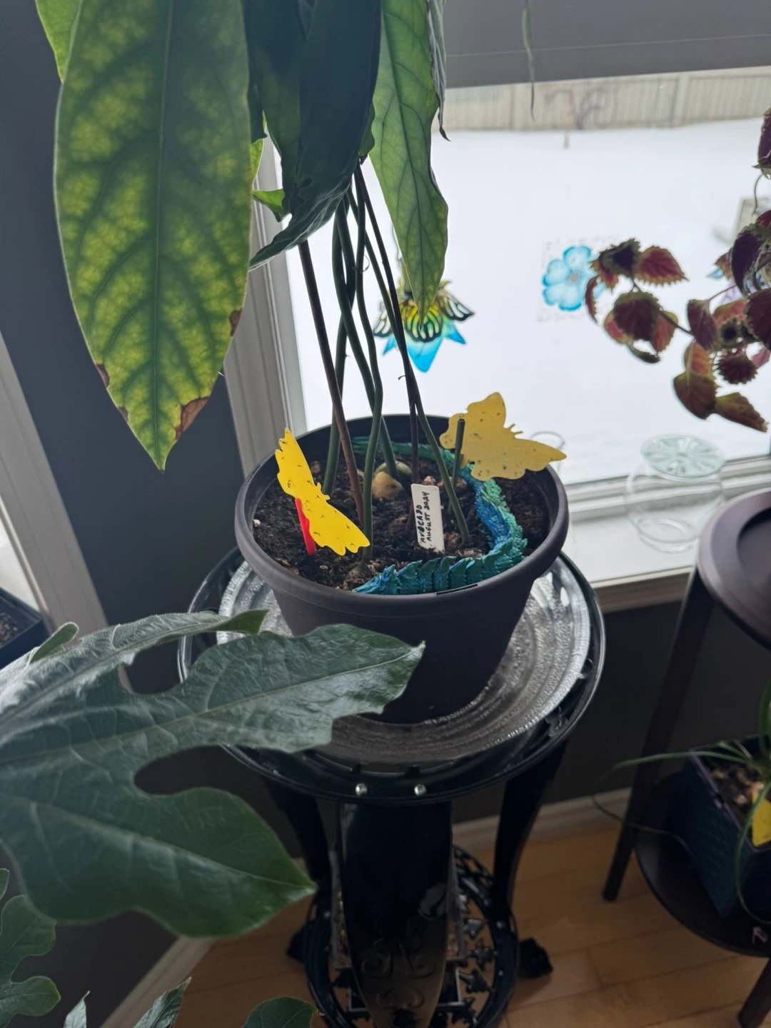 Healthy avocado plants with large green leaves in a black pot and 3D printed water tray. 24 inches high, 5 different species total in 1 pot. A lovely addition to any indoor space. Great for plant enthusiasts!