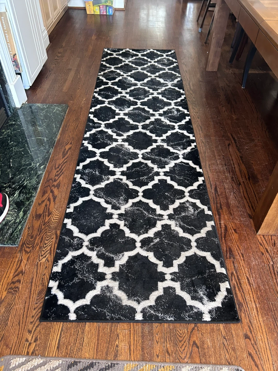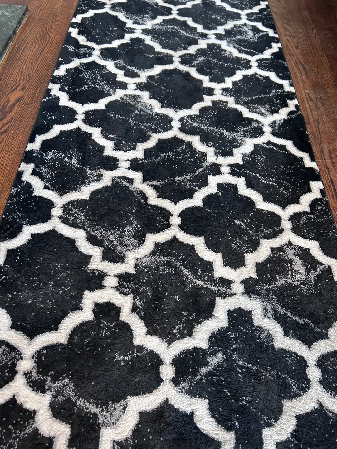 This is a runner rug with a bold black and white geometric pattern. It's made of a soft material, perfect for adding style to hallways or entryways. The design adds a modern touch to your home's flooring.