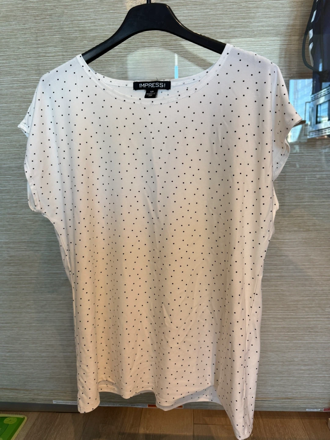 This t-shirt features a classic white background with a black polka dot pattern. It's a comfortable and versatile top with short sleeves. A great addition to any casual wardrobe!