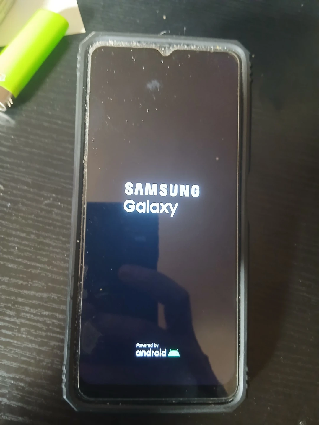 Samsung Galaxy A03s unlocked smartphone in a protective case. It's powered by Android. The case includes a built-in ring stand.