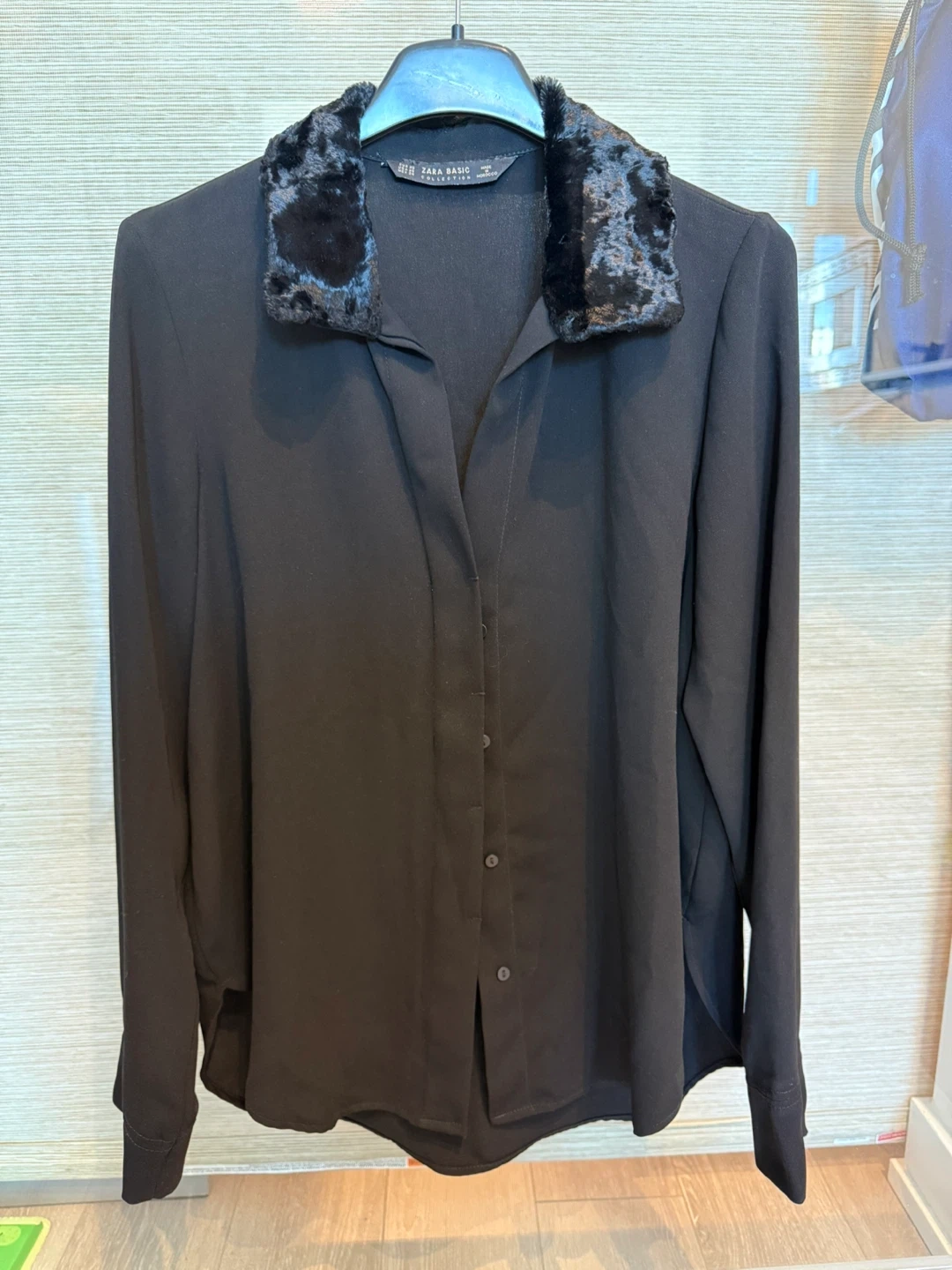 Zara Basic black blouse with a decorative faux fur collar. It has a button-up front and long sleeves. This shirt is suitable for layering or wearing on its own.