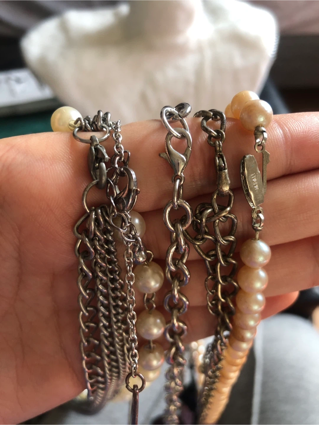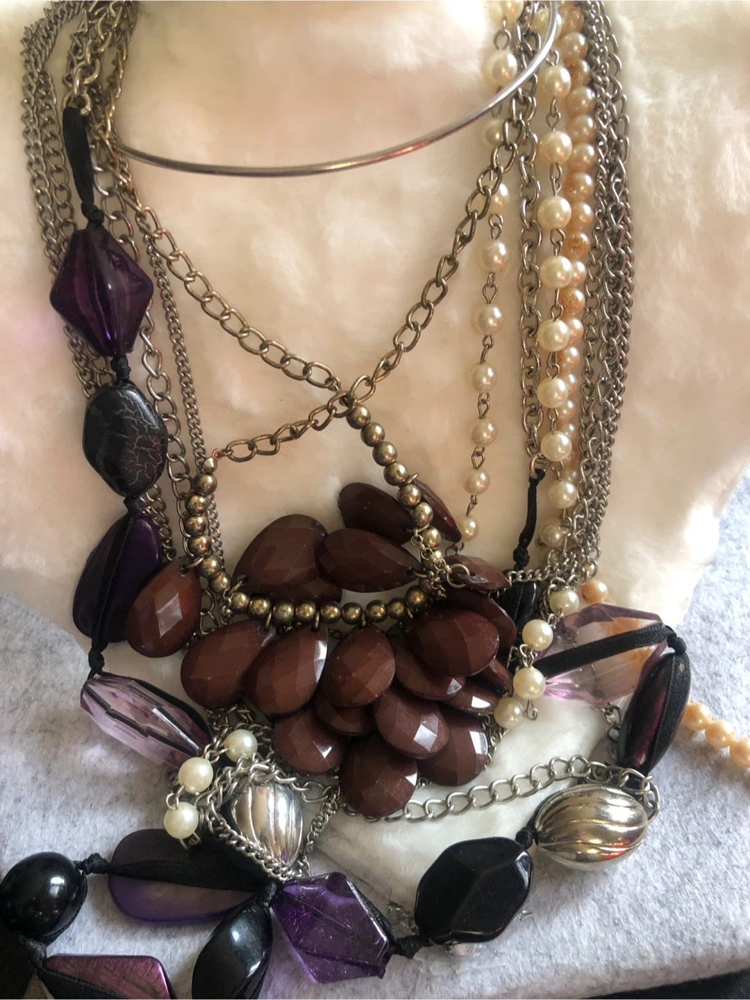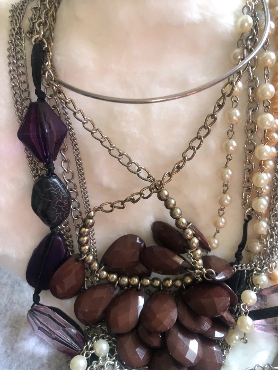 This multi-strand necklace features a variety of beads including faux pearls, purple and brown faceted stones, and silver-tone chains. It's a bold statement piece with a unique mix of textures and colors. Great for adding flair to an outfit!