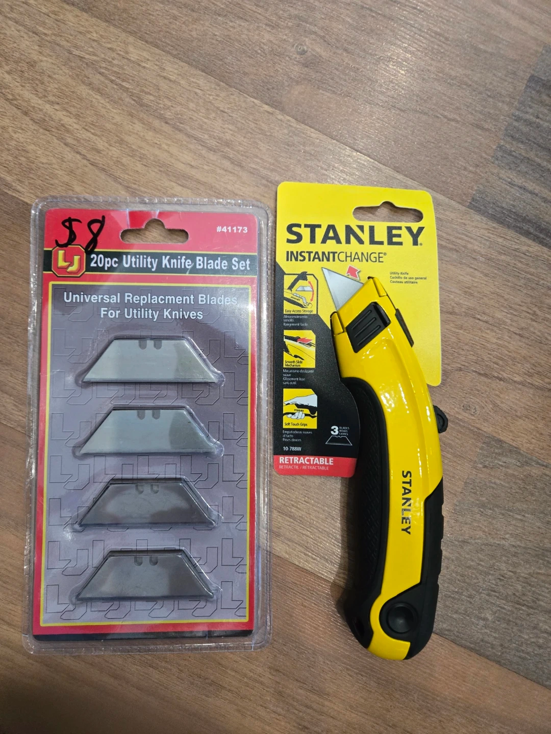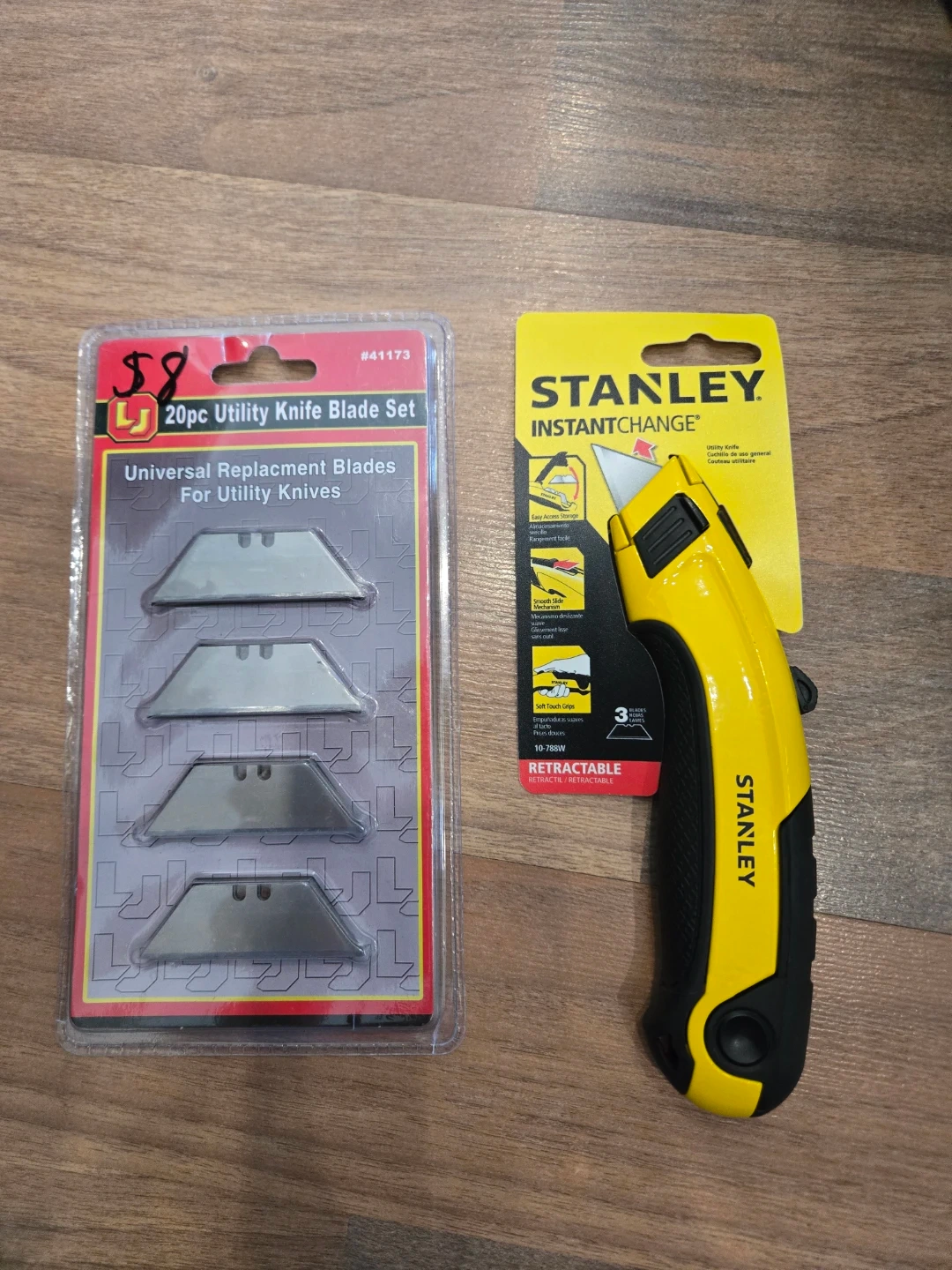 Get this handy Stanley InstantChange utility knife along with a 20-piece universal replacement blade set. The knife features easy access storage, a smooth slide mechanism, and soft touch grips. Blades are universal and suitable for most utility knives. It's great for various cutting tasks around the house or job site!