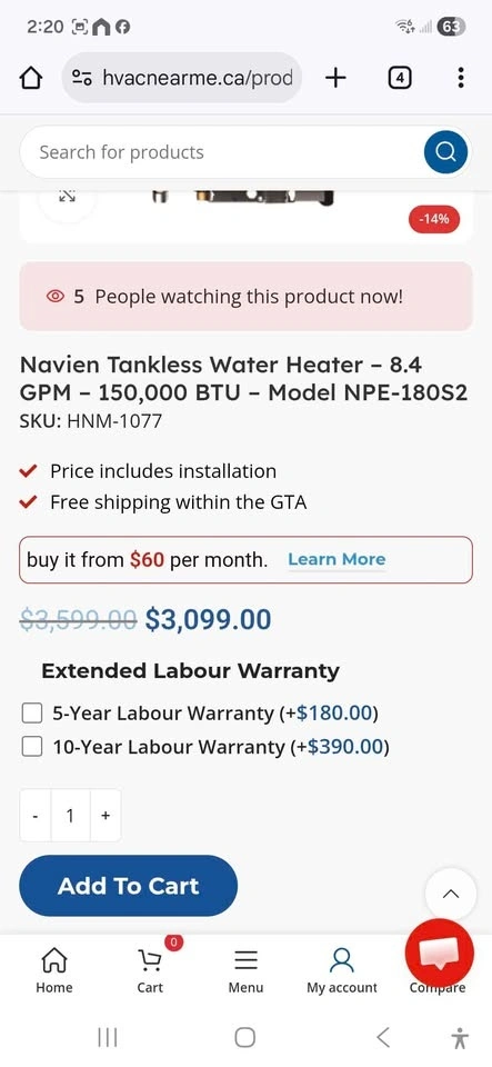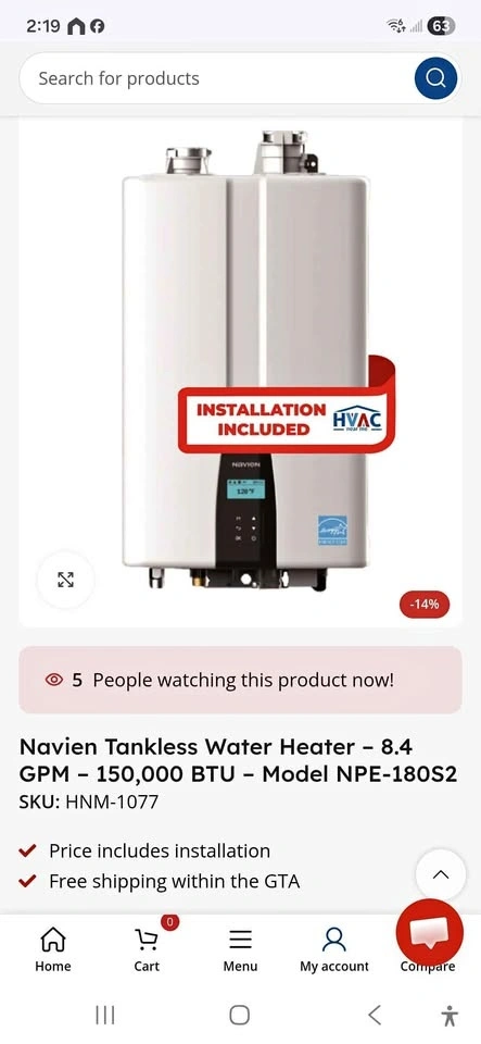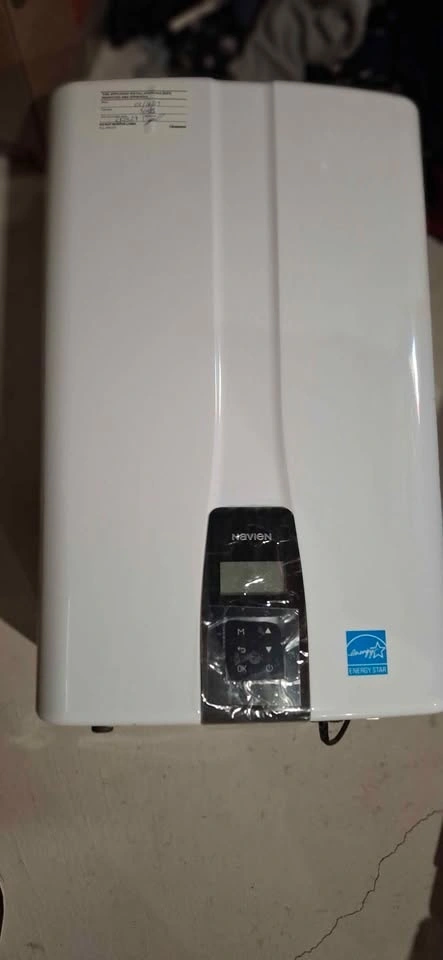 Efficient Navien tankless water heater, Model NPE-180S2 with 8.4 GPM and 150,000 BTU. Runs on natural gas. Still has the protective plastic film on the display. Used for only 20 days, it's like new! Ready for a new home.