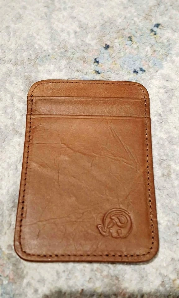 Slim brown leather card holder with multiple slots for cards. Features a cool embossed elephant logo on the front. Good for keeping your cards organized and easy to grab.