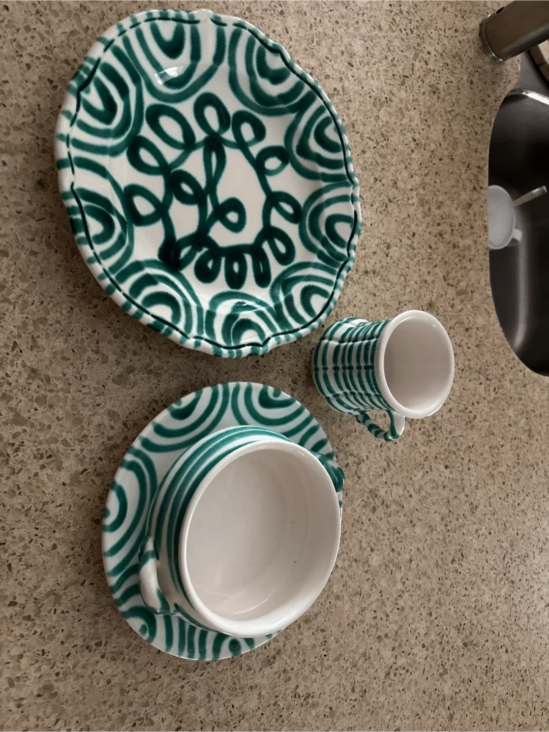 8 person dinner set and many other side dishes like cups, napkins holders, tea carafe etc. all together 4 boxes. Original Austrian Gmundner. Features a green swirl pattern on a white ceramic base. Ceramic material.