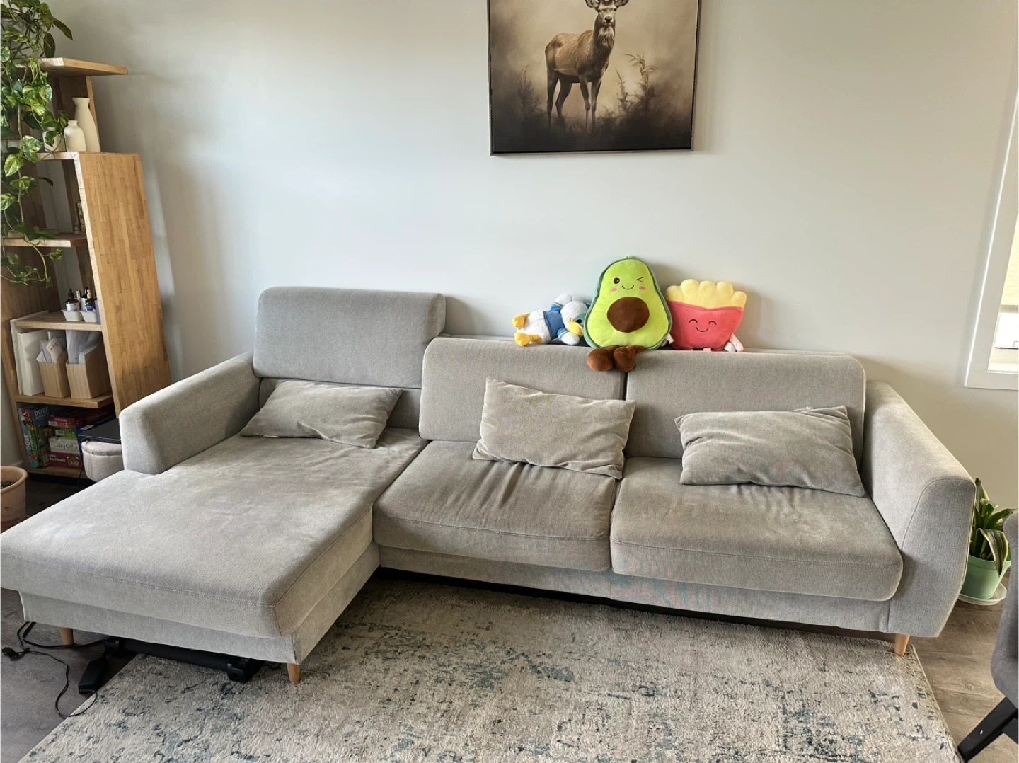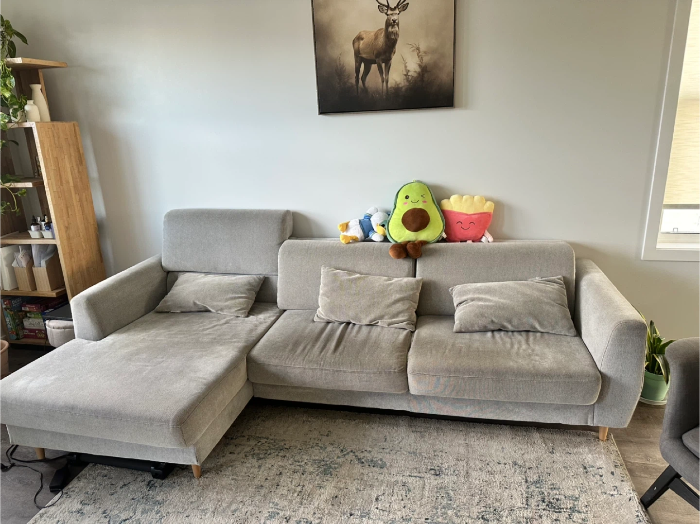 Comfortable ikea grey sectional sofa with a chaise lounge. Features plush cushions and a modern design. Perfect for lounging and entertaining!