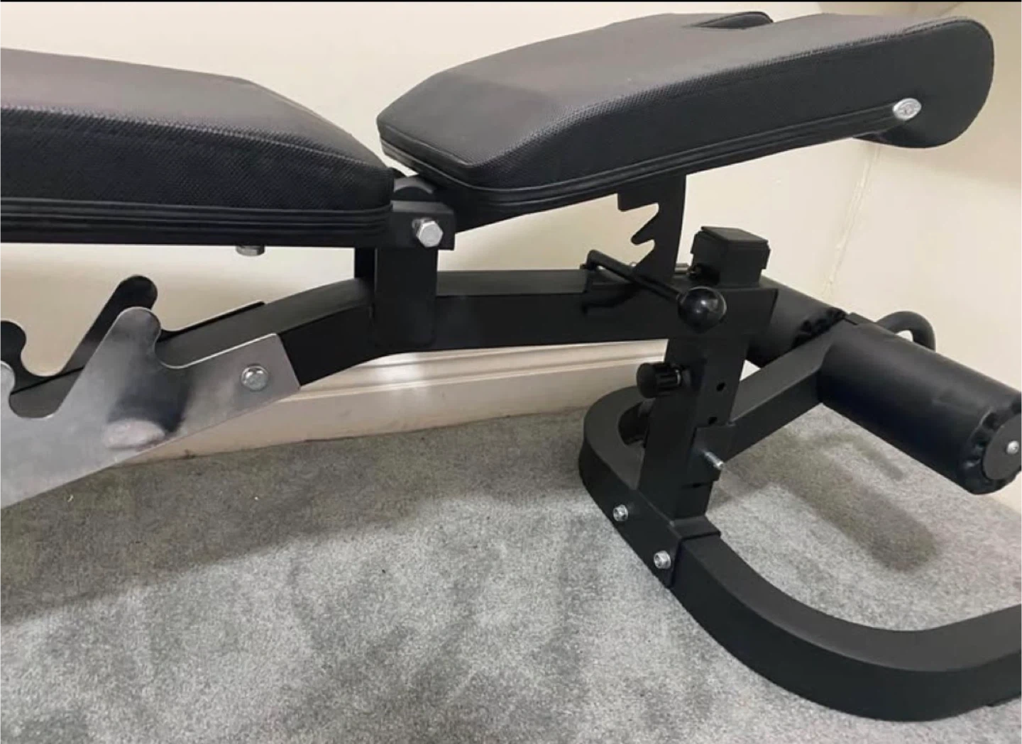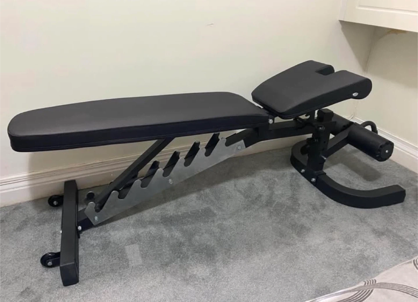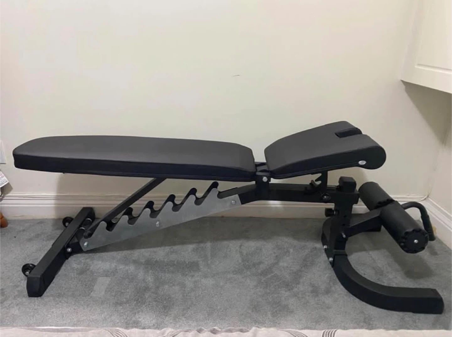 This is an adjustable weight bench. It's constructed with durable steel and black upholstered padding. The bench allows for various incline and decline positions for a full-body workout. It's suitable for home gym use.
