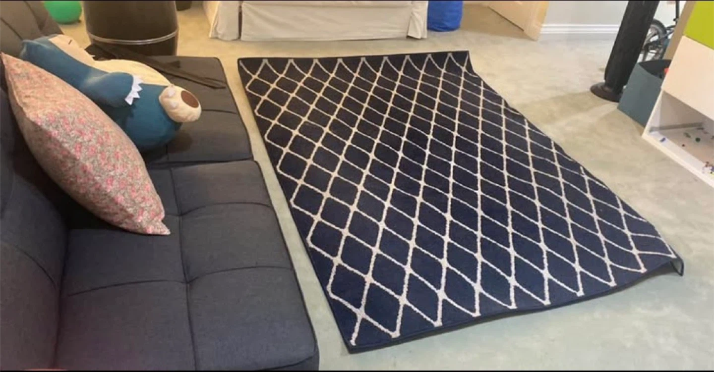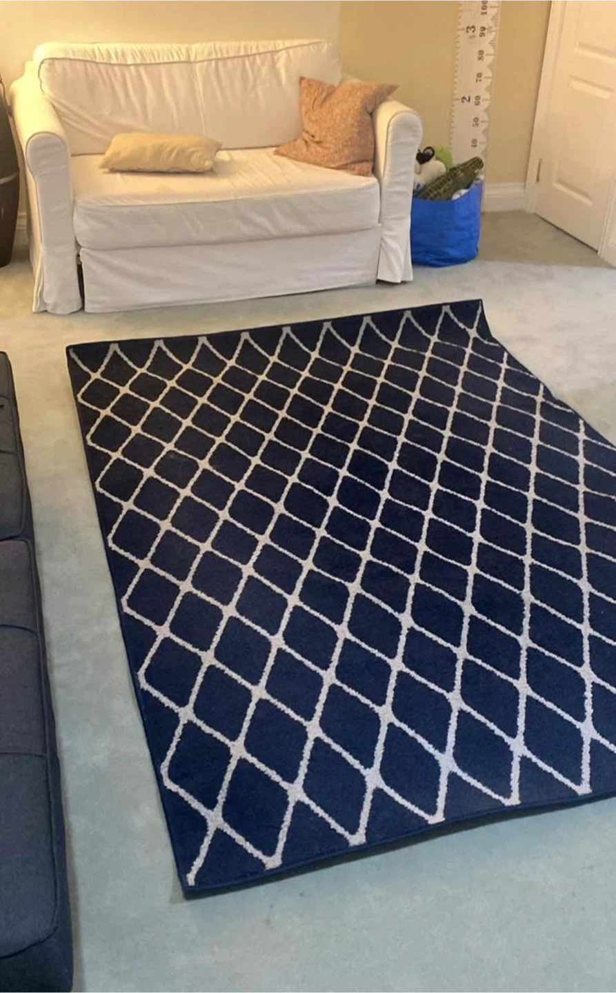 This navy blue area rug features a classic white diamond pattern. It's perfect for adding a touch of style to any room. The rug's material is light and durable.