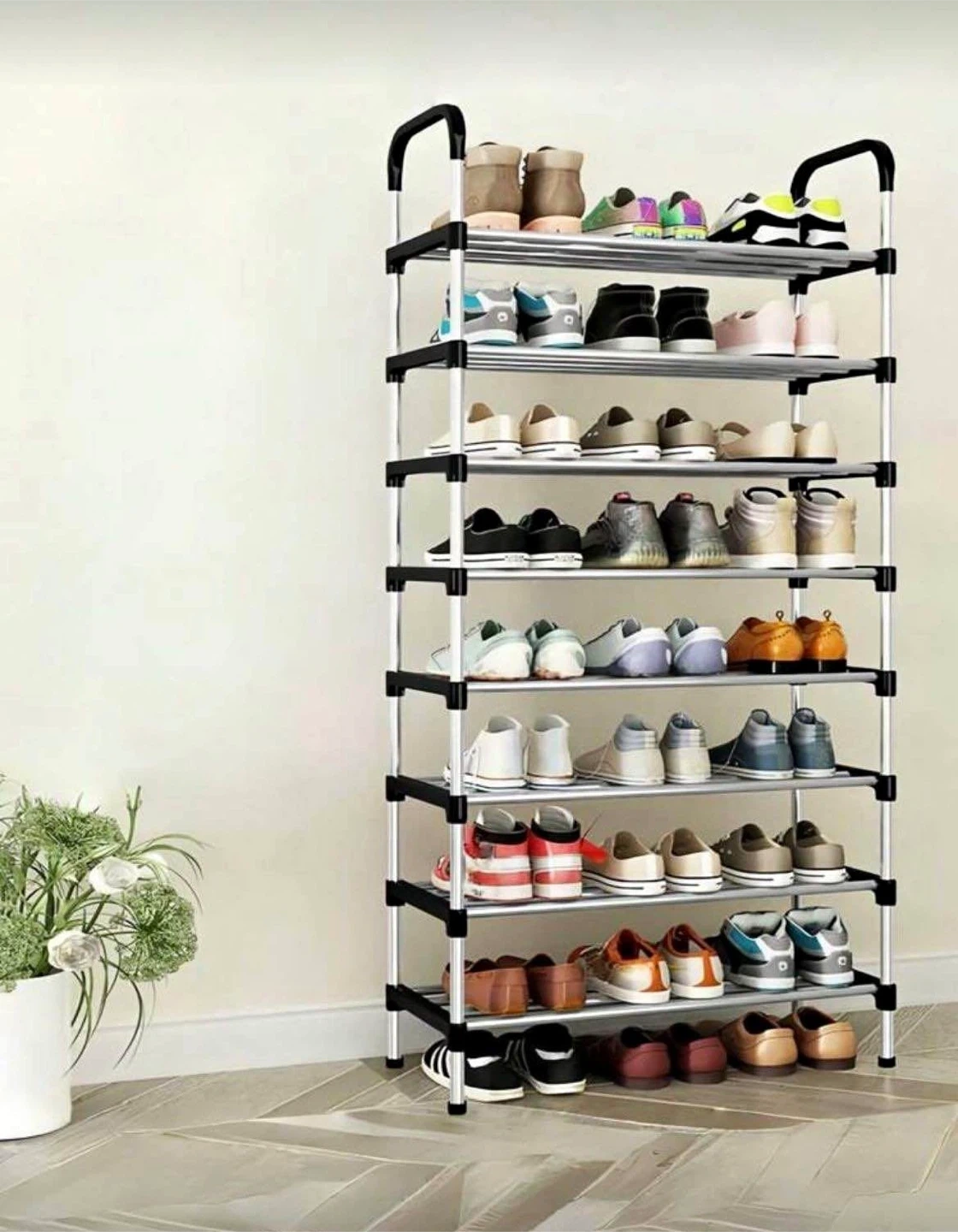 This is a handy 8-tier shoe rack, perfect for organizing your footwear. It's made with durable metal and plastic components. The rack offers ample space for multiple pairs of shoes across its levels. Keeps your entryway or closet tidy and your shoes easily accessible!