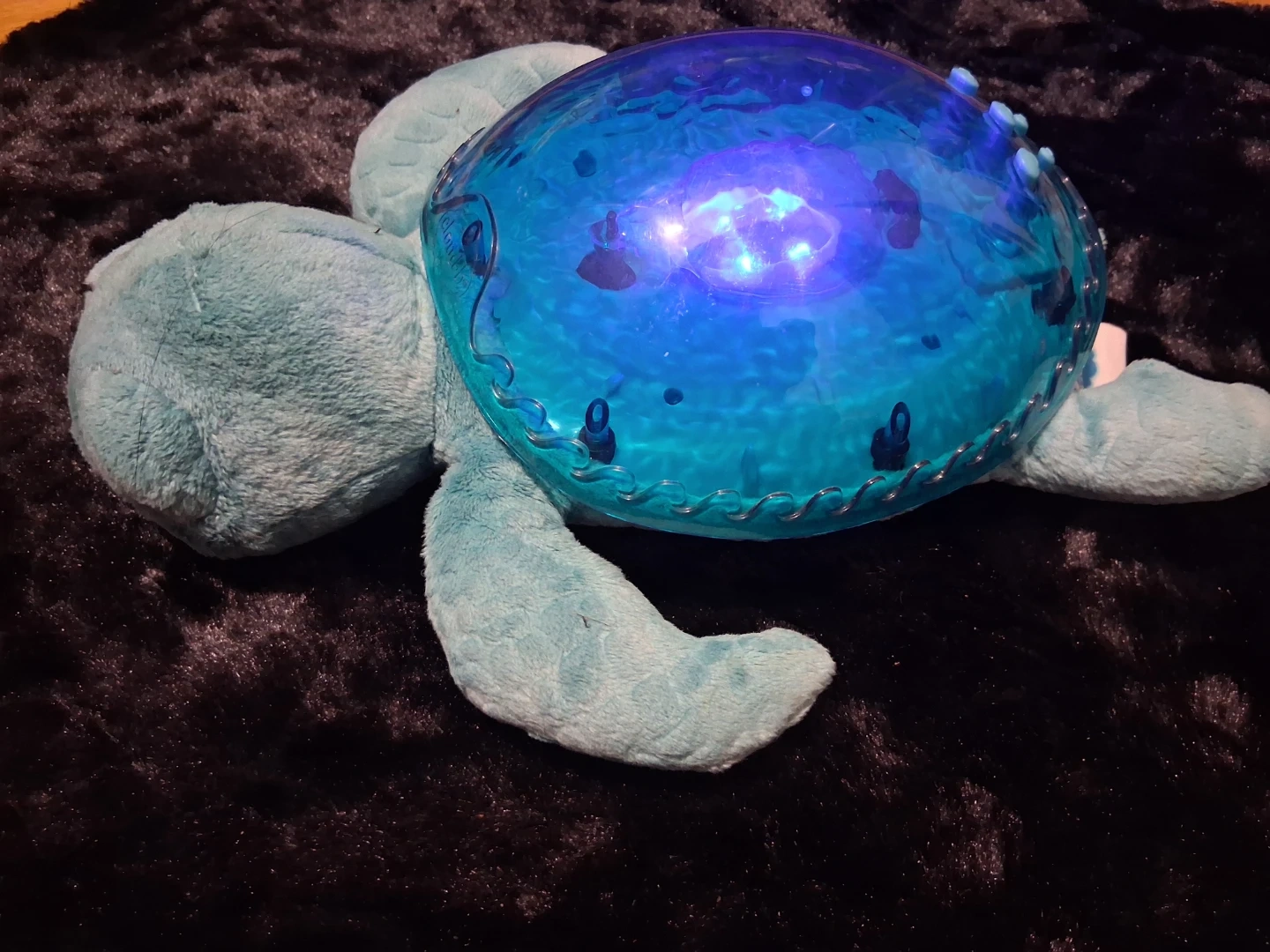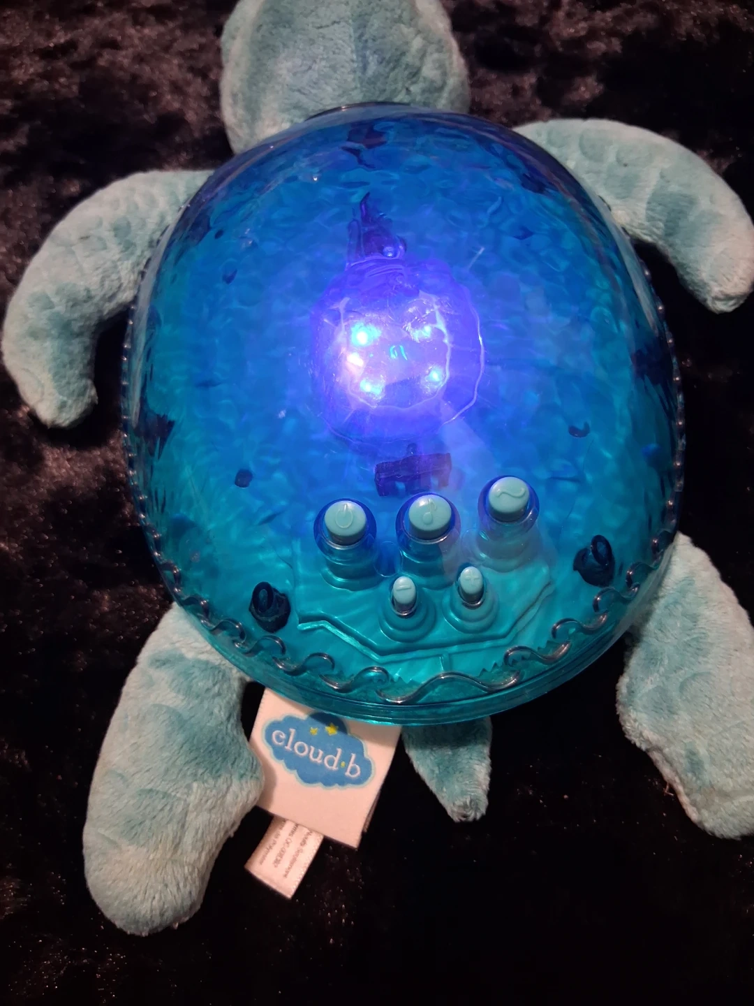 This plush turtle projects a starry night sky onto walls and ceilings. It features multiple color options and soothing sounds. Batteries required for operation.