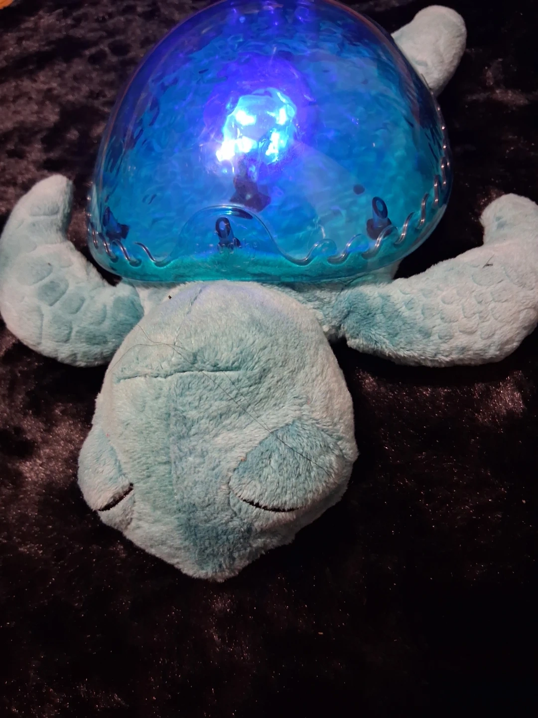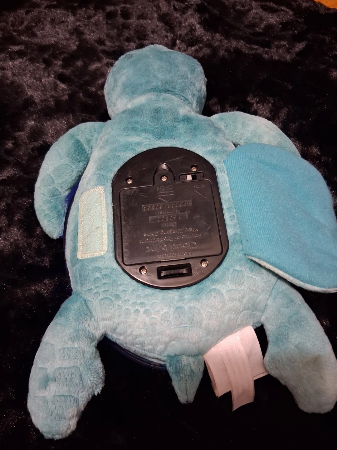 This plush turtle projects a starry night sky onto walls and ceilings. It features multiple color options and soothing sounds. Batteries required for operation.