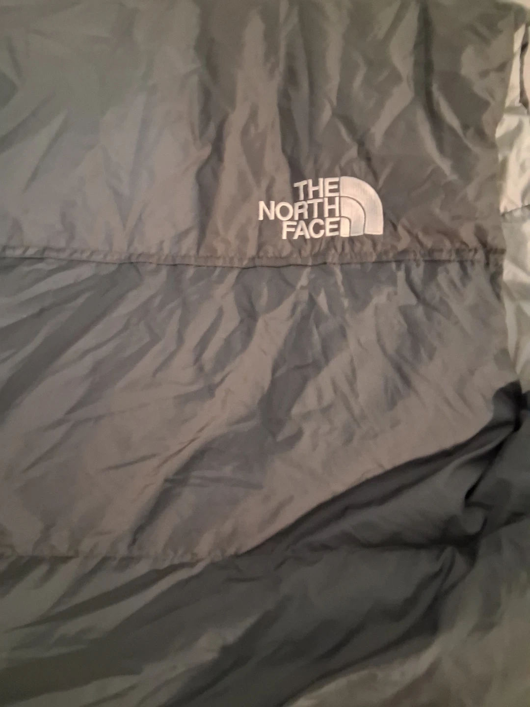 This is a The North Face puffer jacket . It's a dark grey and black colour. Great for keeping warm without having to worry about a thick jacket making you sweat.