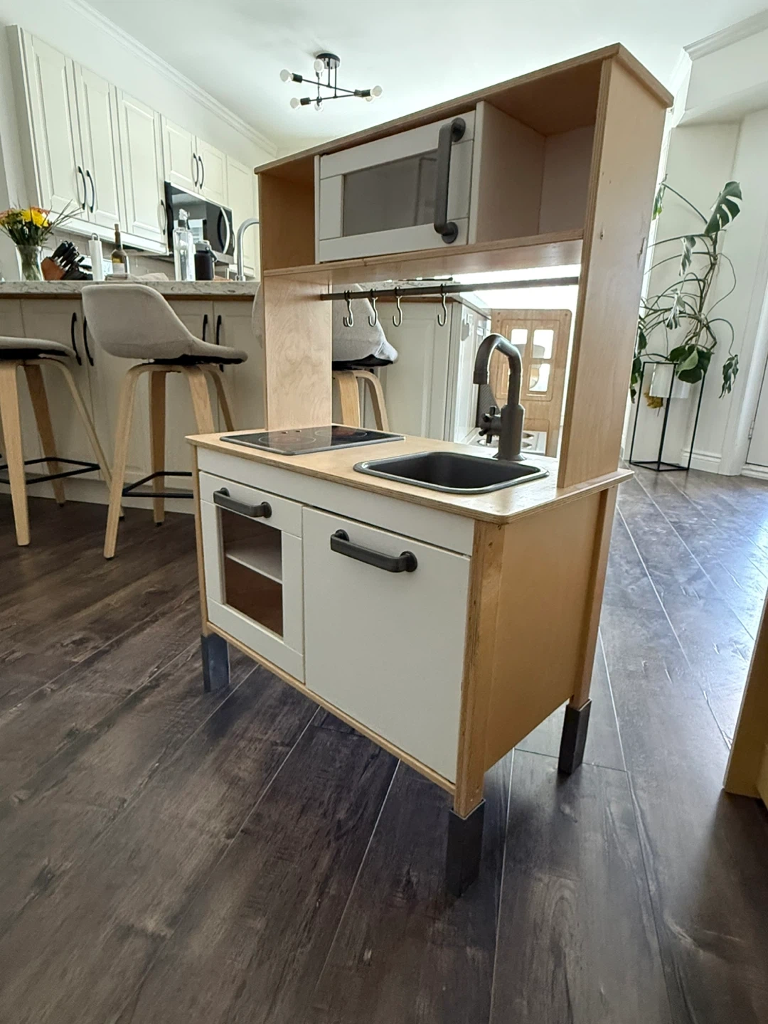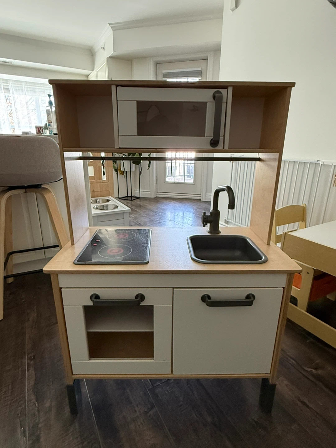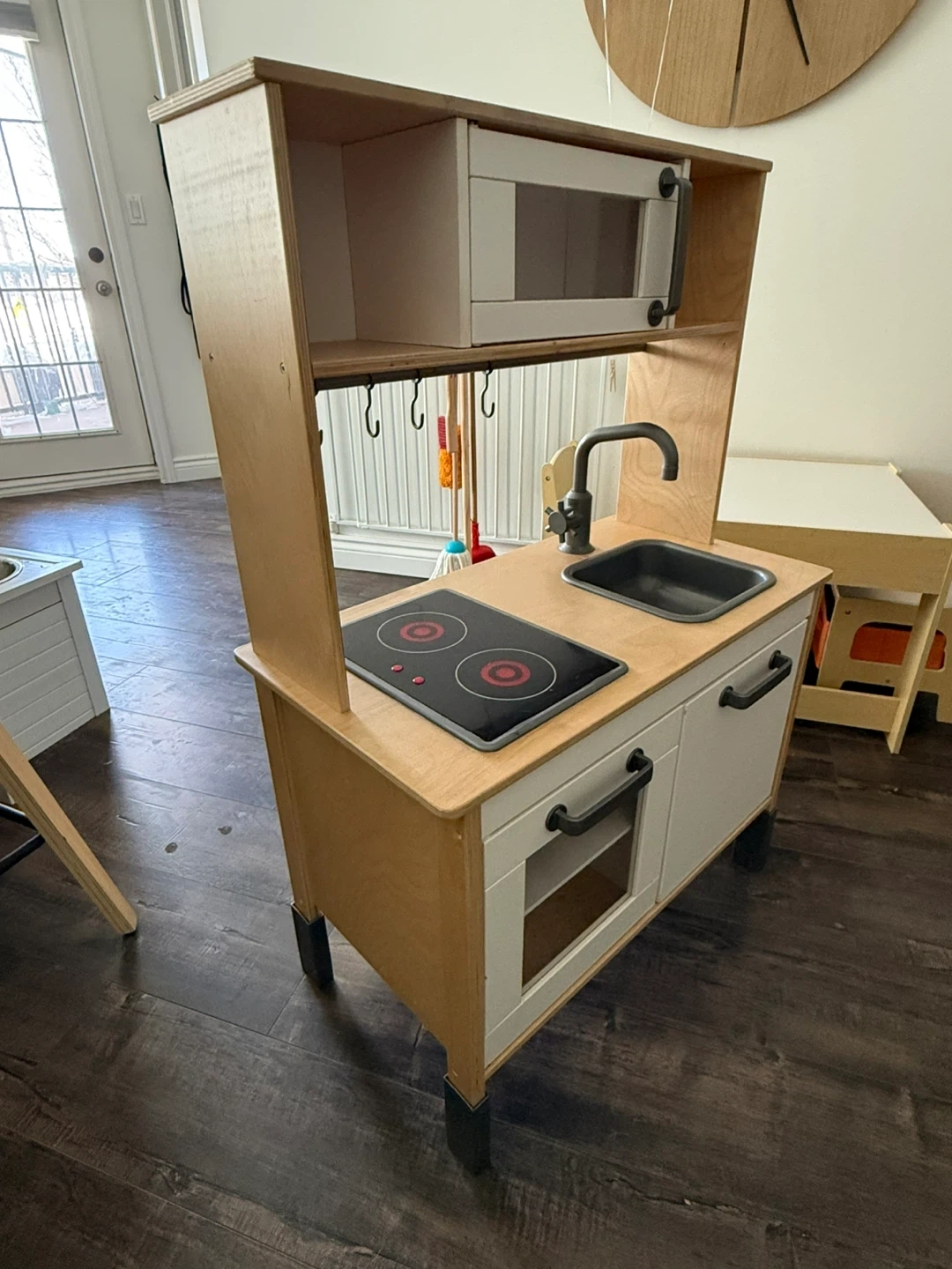 This is a used wood Montessori play kitchen for little ones. It features a microwave, a stovetop with two burners (no batteries in it), a sink with a faucet and a bar with utensil hooks. It also has cabinet storage below the counter. It's a great addition to a play area for imaginative fun! Used for 1 year.
