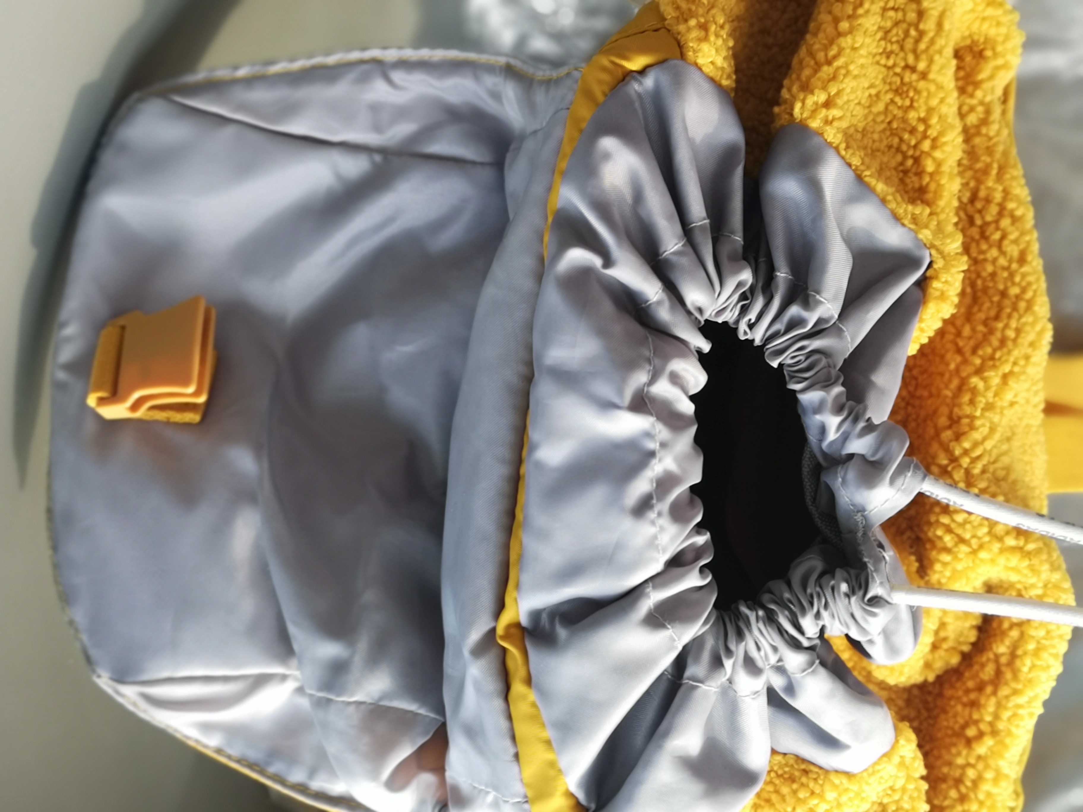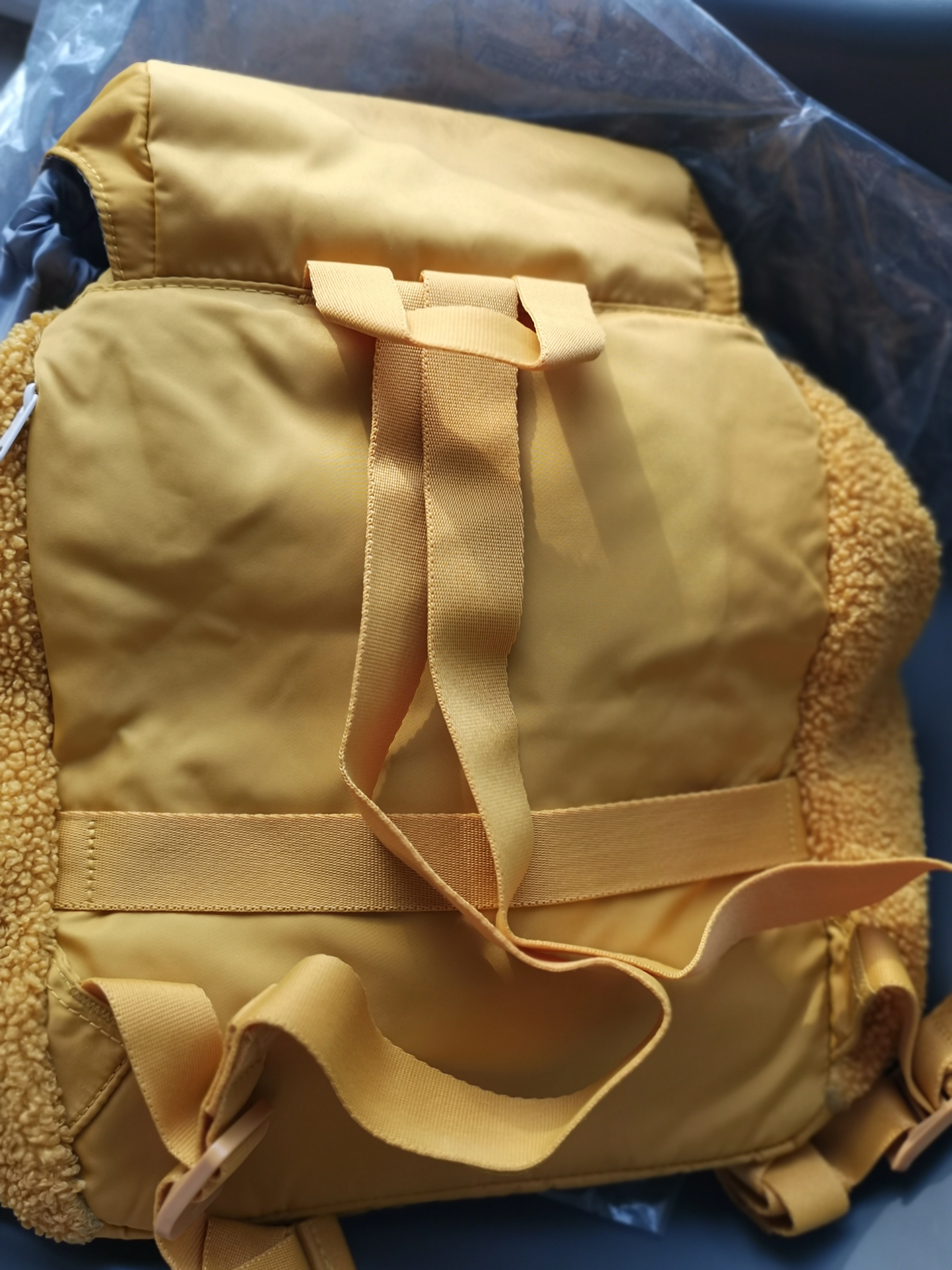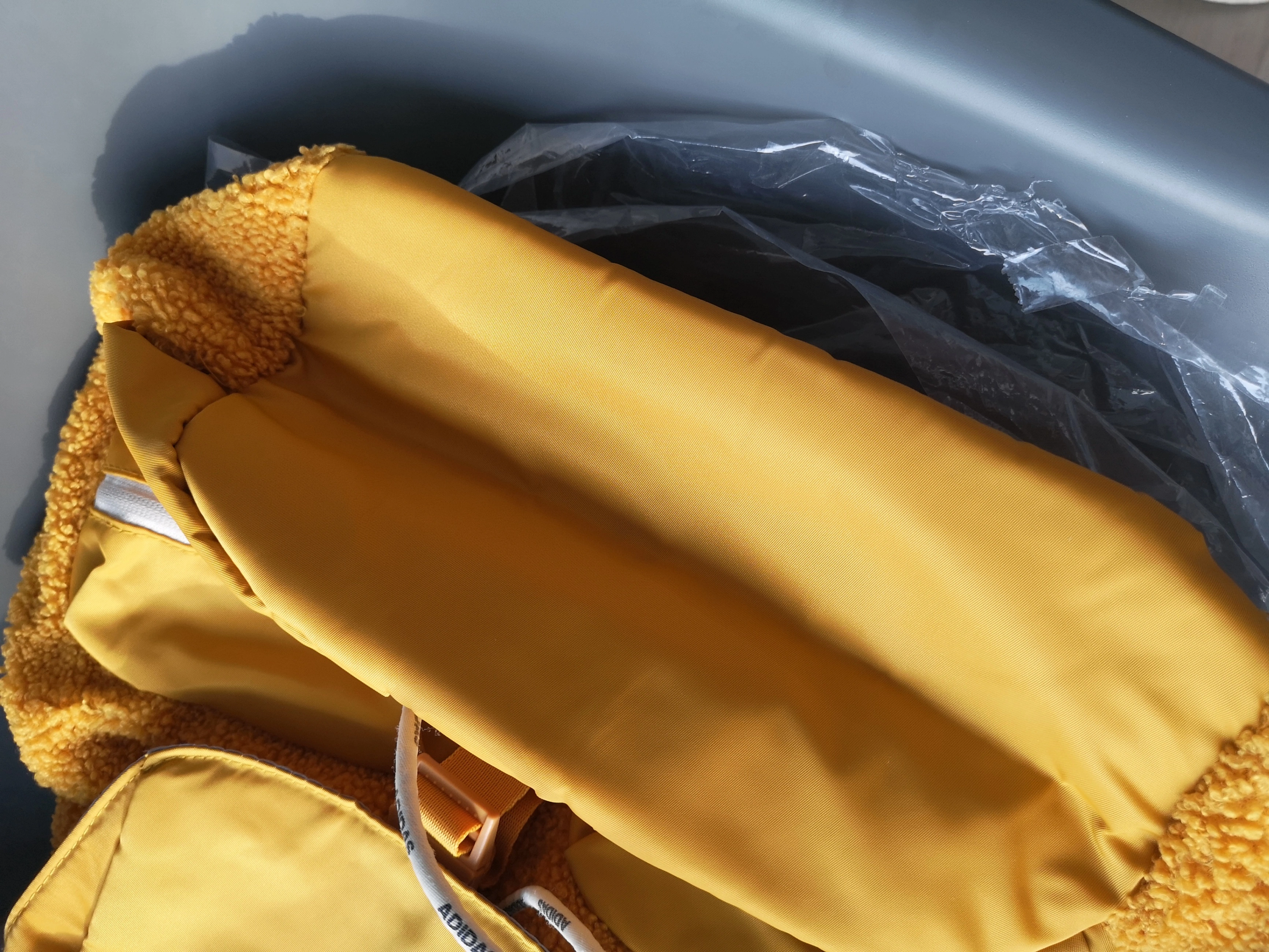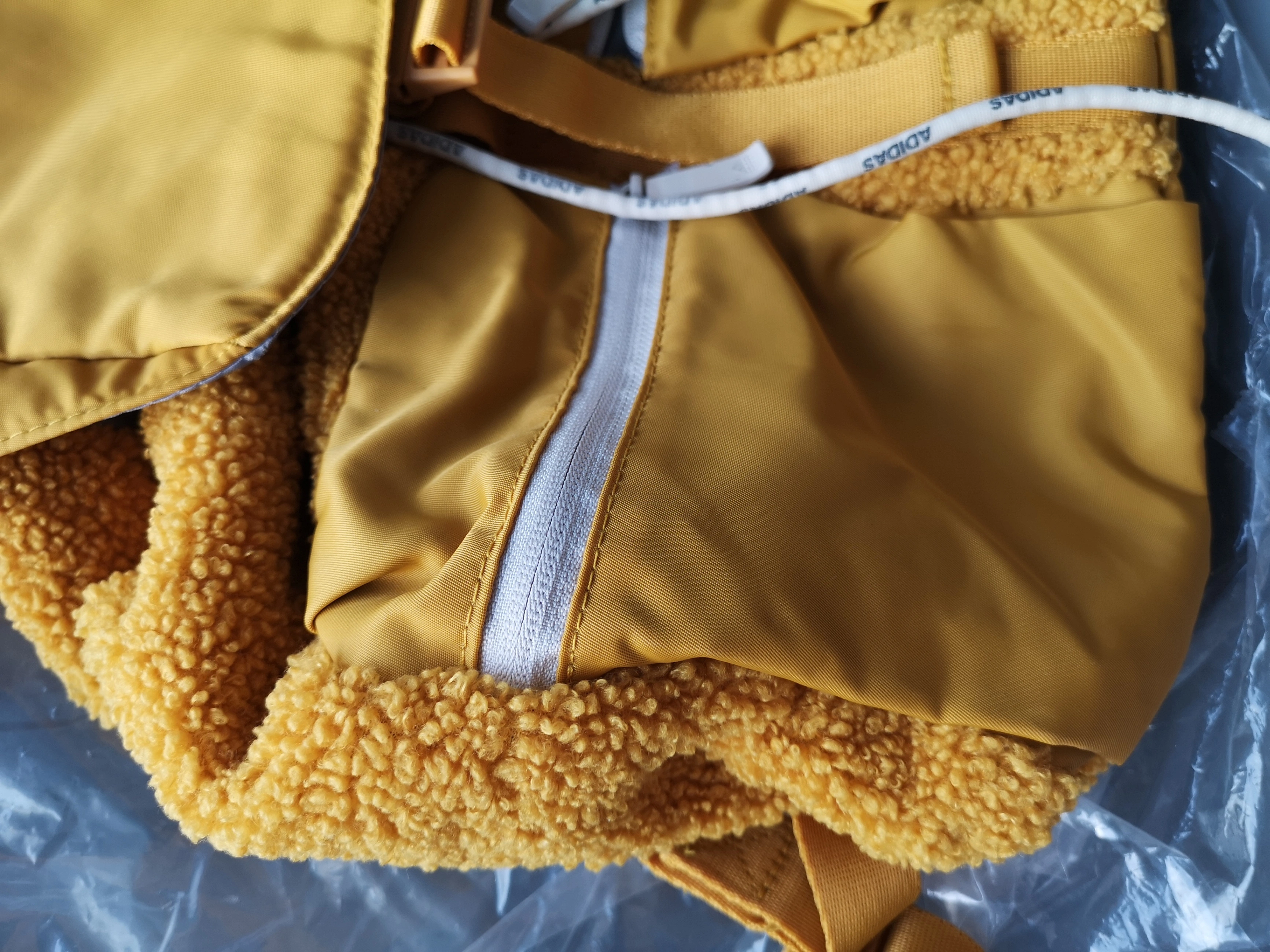 This is an Adidas sherpa fleece backpack in a vibrant yellow colour! It's a stylish and functional bag that's perfect for everyday use or outdoor adventures. The sherpa fleece lining adds a cozy touch, making it a unique and eye-catching accessory