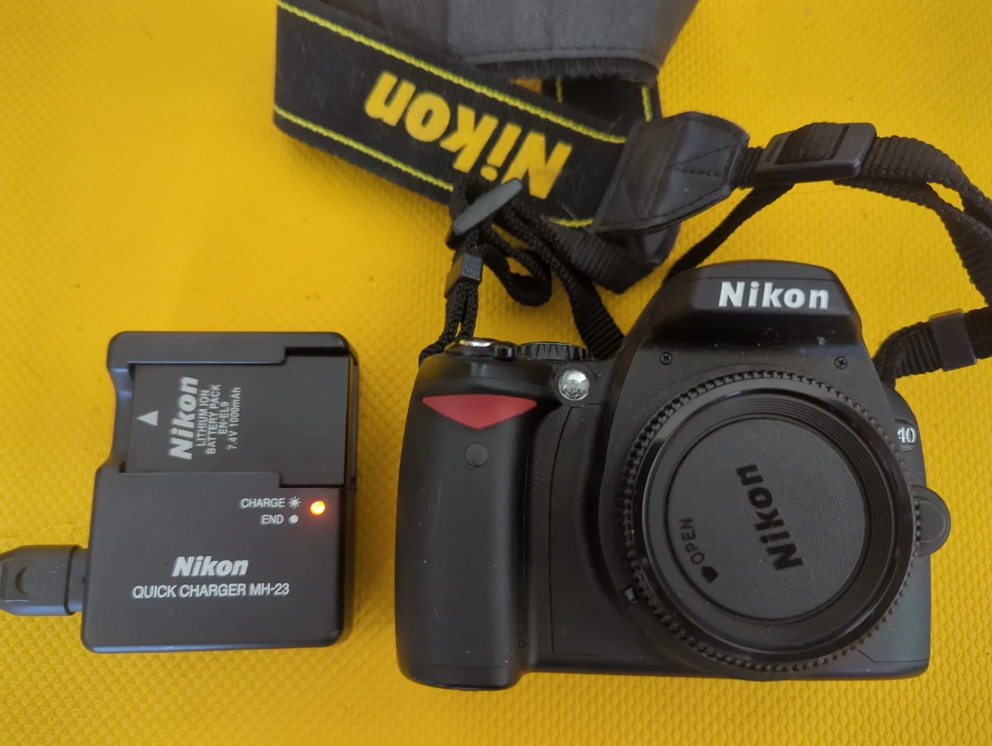 This is a Nikon D40 digital camera, see notes below. It comes with its original charger and a Nikon branded strap. No lens. The camera is black and features an easy-to-use interface. It's a great option for capturing everyday moments and learning the basics of photography!