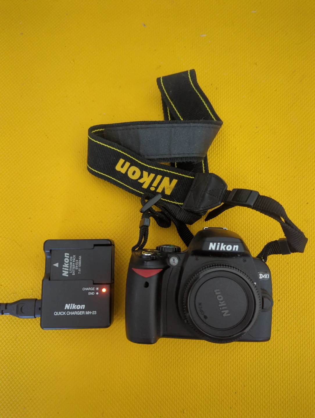 This is a Nikon D40 digital camera, see notes below. It comes with its original charger and a Nikon branded strap. No lens. The camera is black and features an easy-to-use interface. It's a great option for capturing everyday moments and learning the basics of photography!