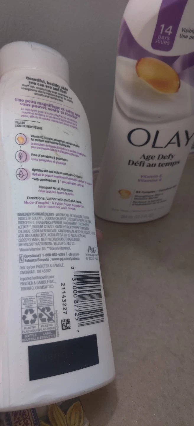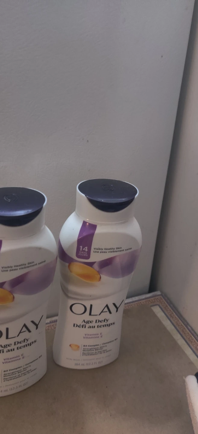 Olay Age Defy body wash nourishes and strengthens skin for a smooth and healthy look. It contains Vitamin E and B3 Complex to hydrate skin and lock in moisture for 24 hours. Designed for all skin types.