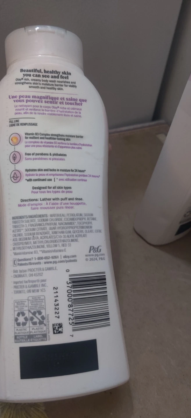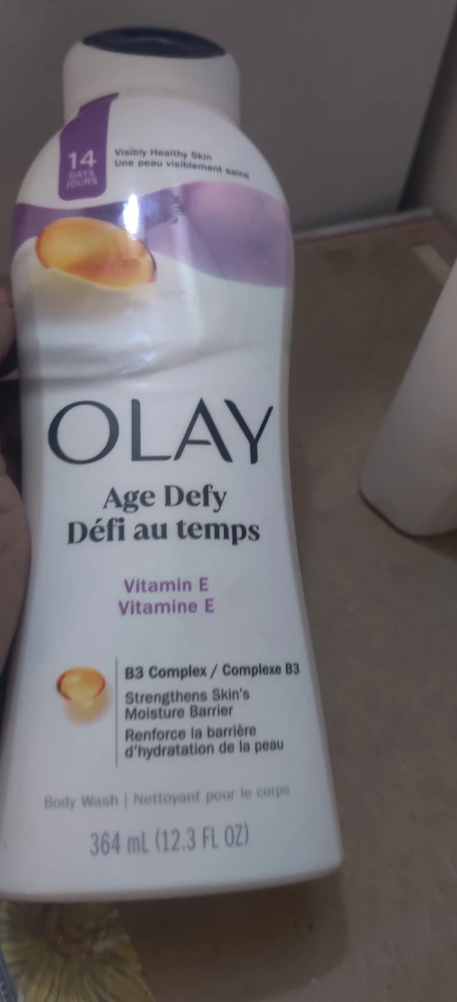 Olay Age Defy body wash nourishes and strengthens skin for a smooth and healthy look. It contains Vitamin E and B3 Complex to hydrate skin and lock in moisture for 24 hours. Designed for all skin types.