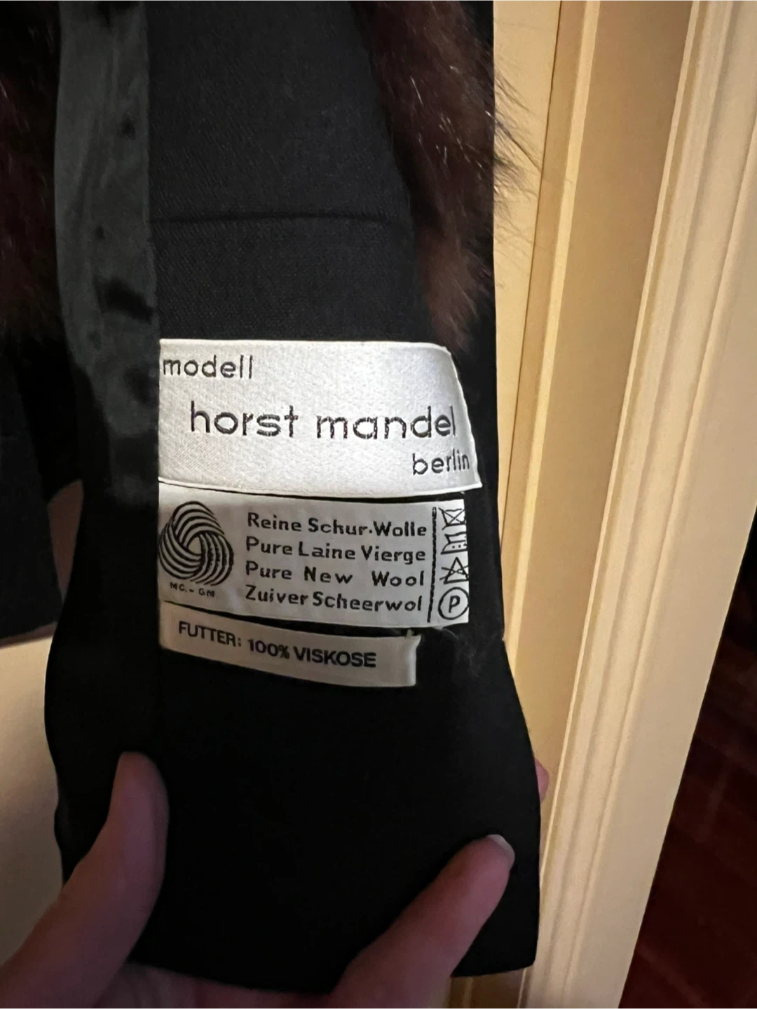 This elegant Horst Mandel jacket is crafted from pure new wool and features a detachable fur collar. It's fully lined with 100% viscose. The belted waist offers a flattering silhouette. Size is a medium, barely worn maybe once or twice.