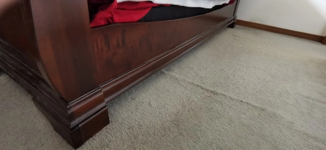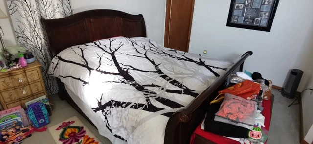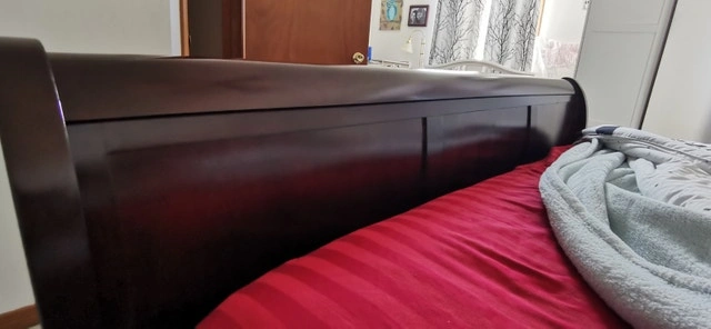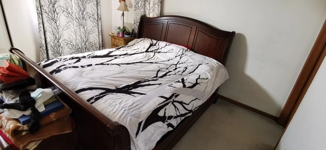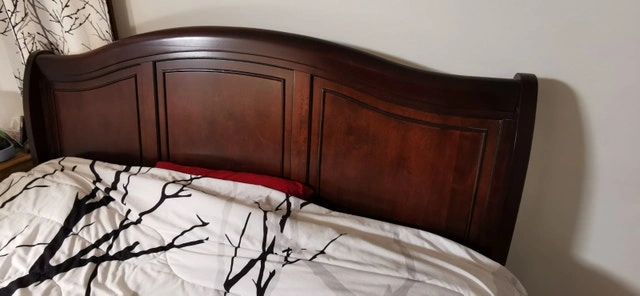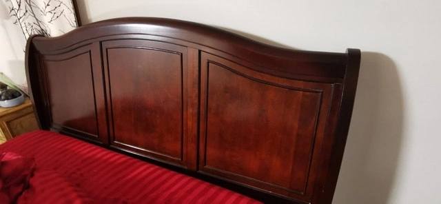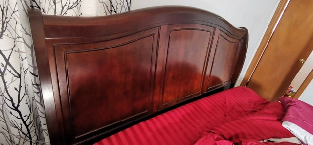 King size sleigh bed, solid cherry wood we believe. Bought at The Brick. Sheets, blankets, mattress, and pillows not included. Like new condition. Asking $950 or best offer.