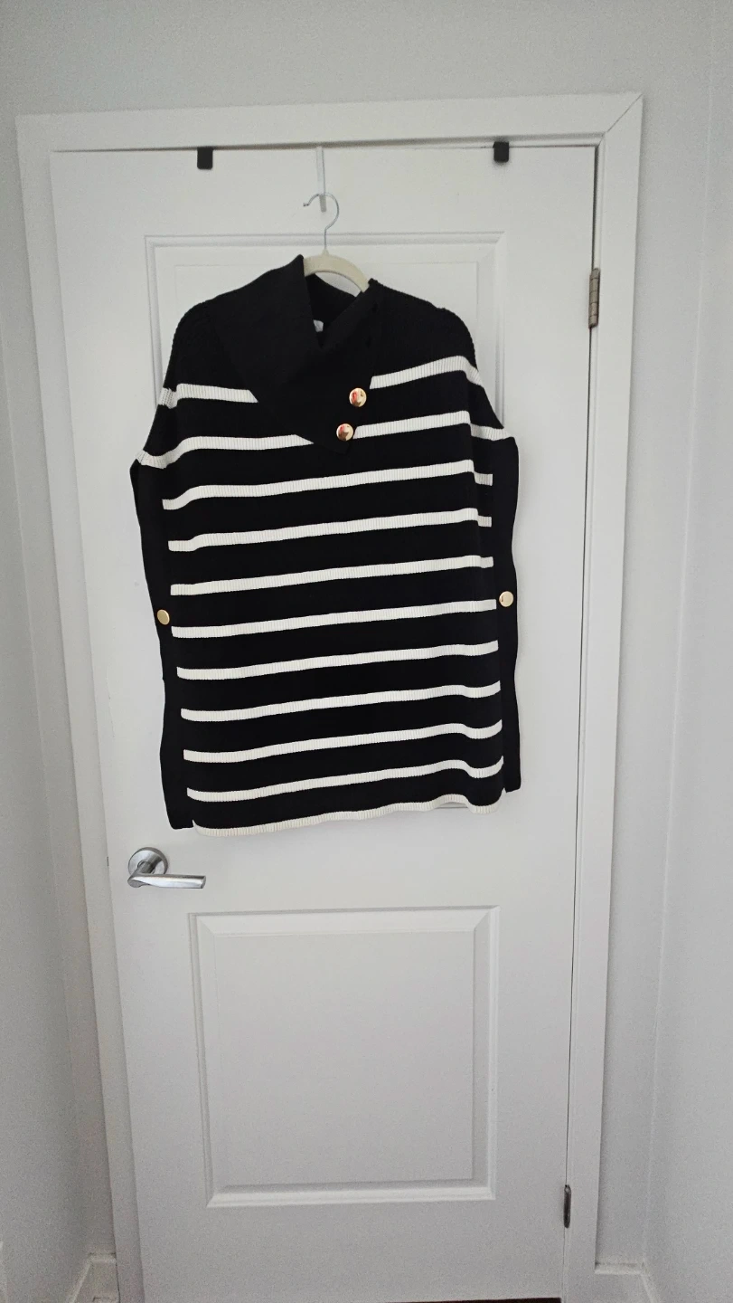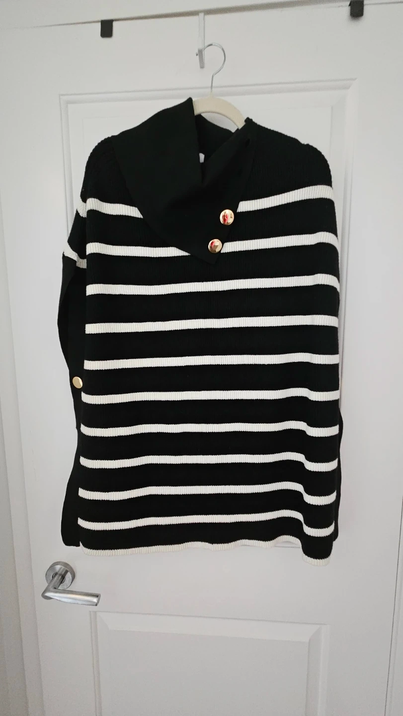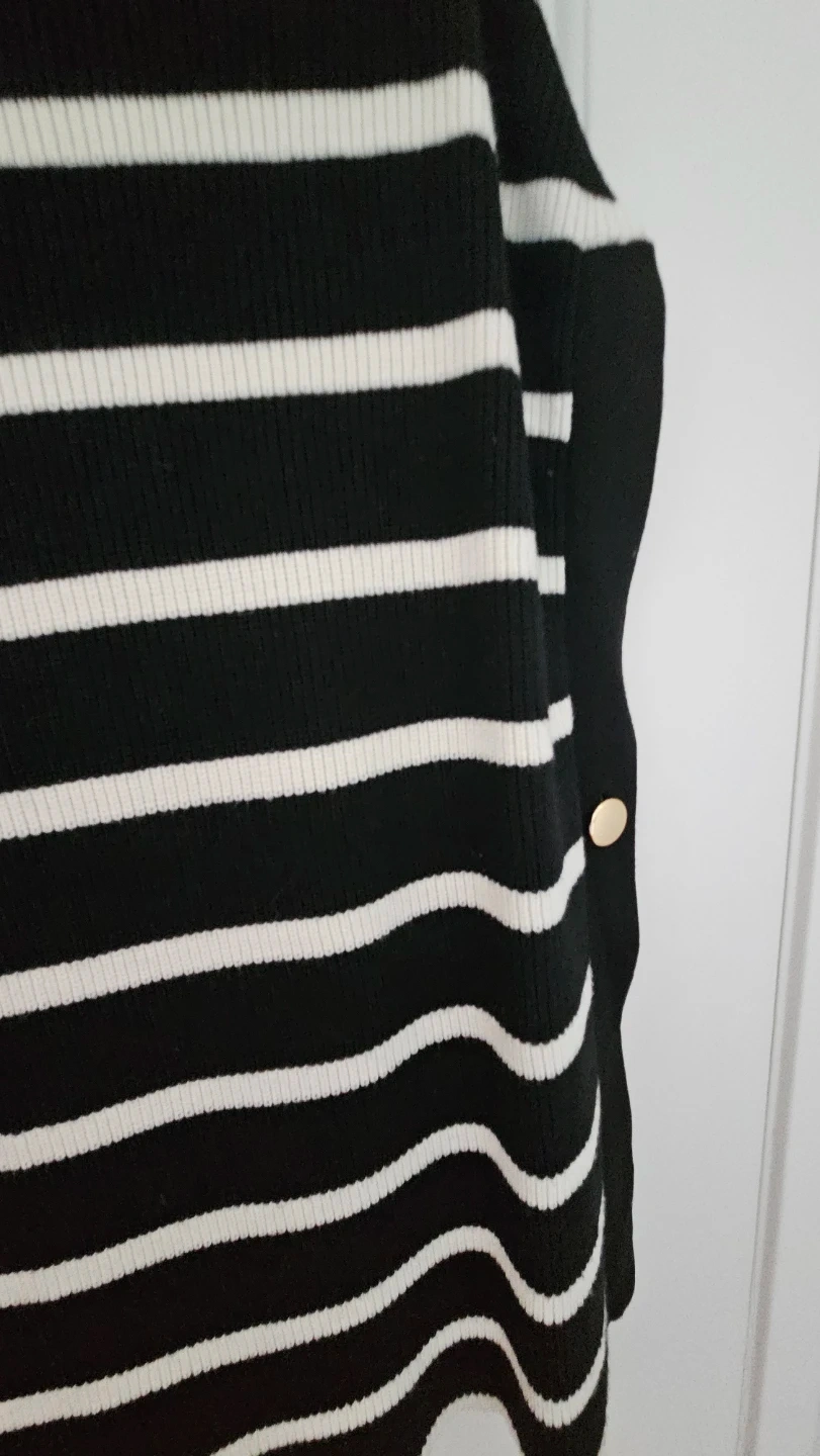 Beautiful Poncho Sweater by Suzy Shier sweater in a size Medium. It features a black and white stripe pattern with gold-toned buttons on the side and neckline. Opens both slightly or fully on the side, with beautiful gold buttons to close the side. Stylish and versatile, perfect for work, evening or everyday wear. Virtually brand new.