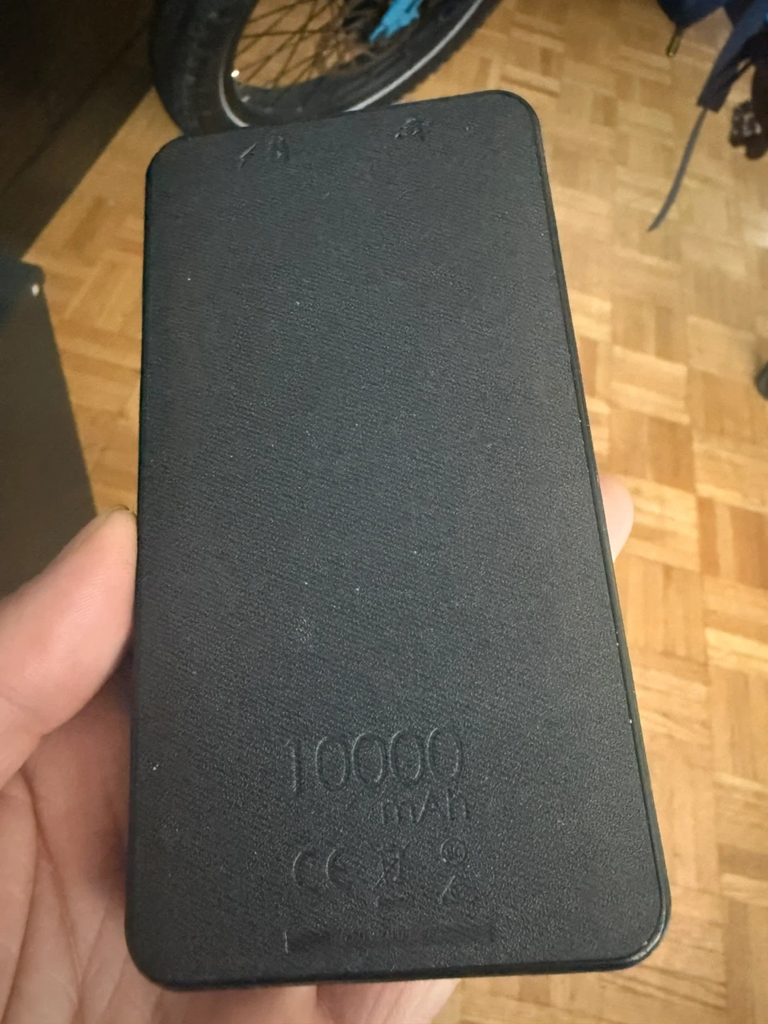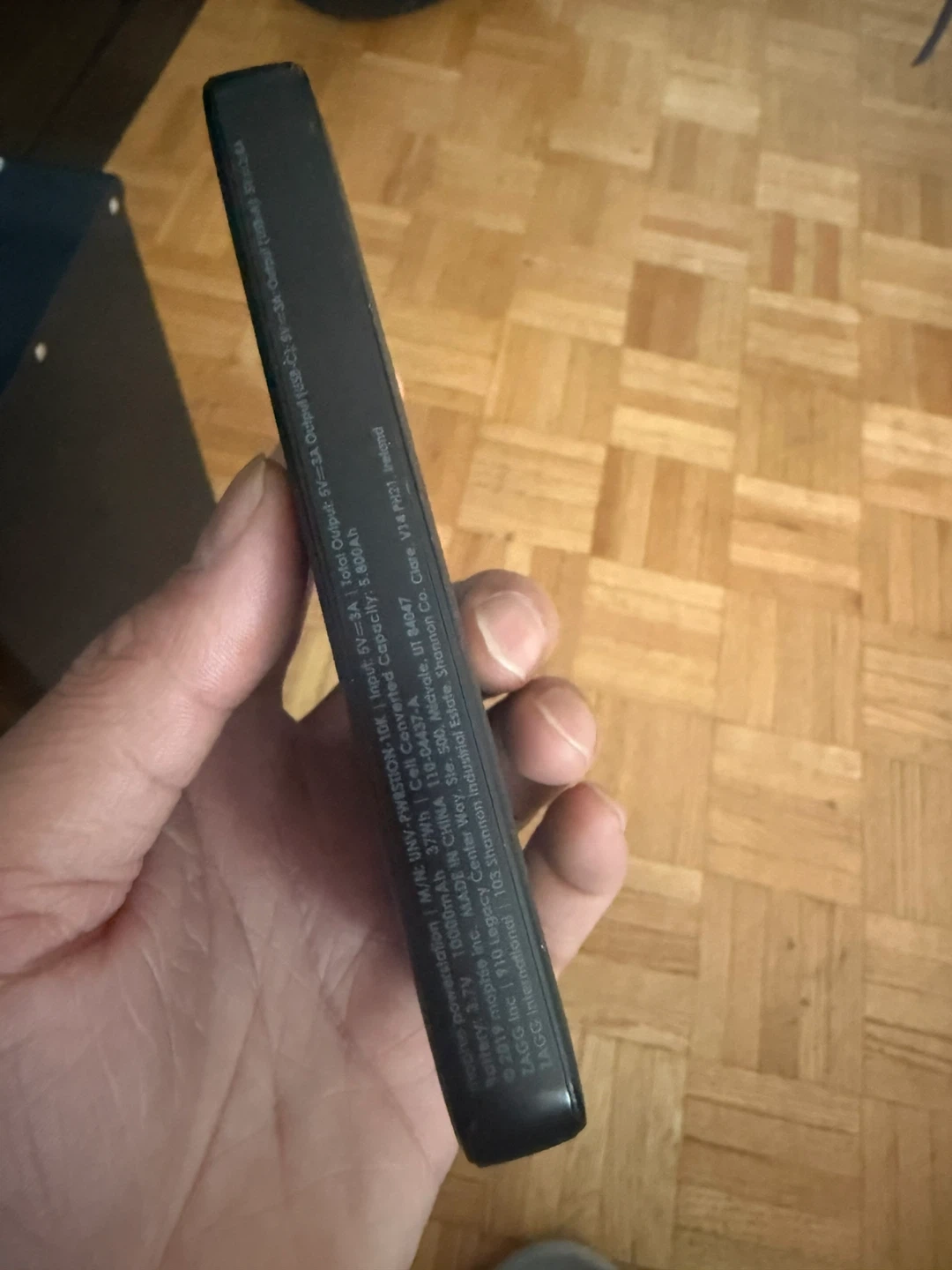 This is an Anker PowerCore portable charger with a 10000 mAh capacity. It's black and made of plastic. It included a USB-C input and USB-A output.