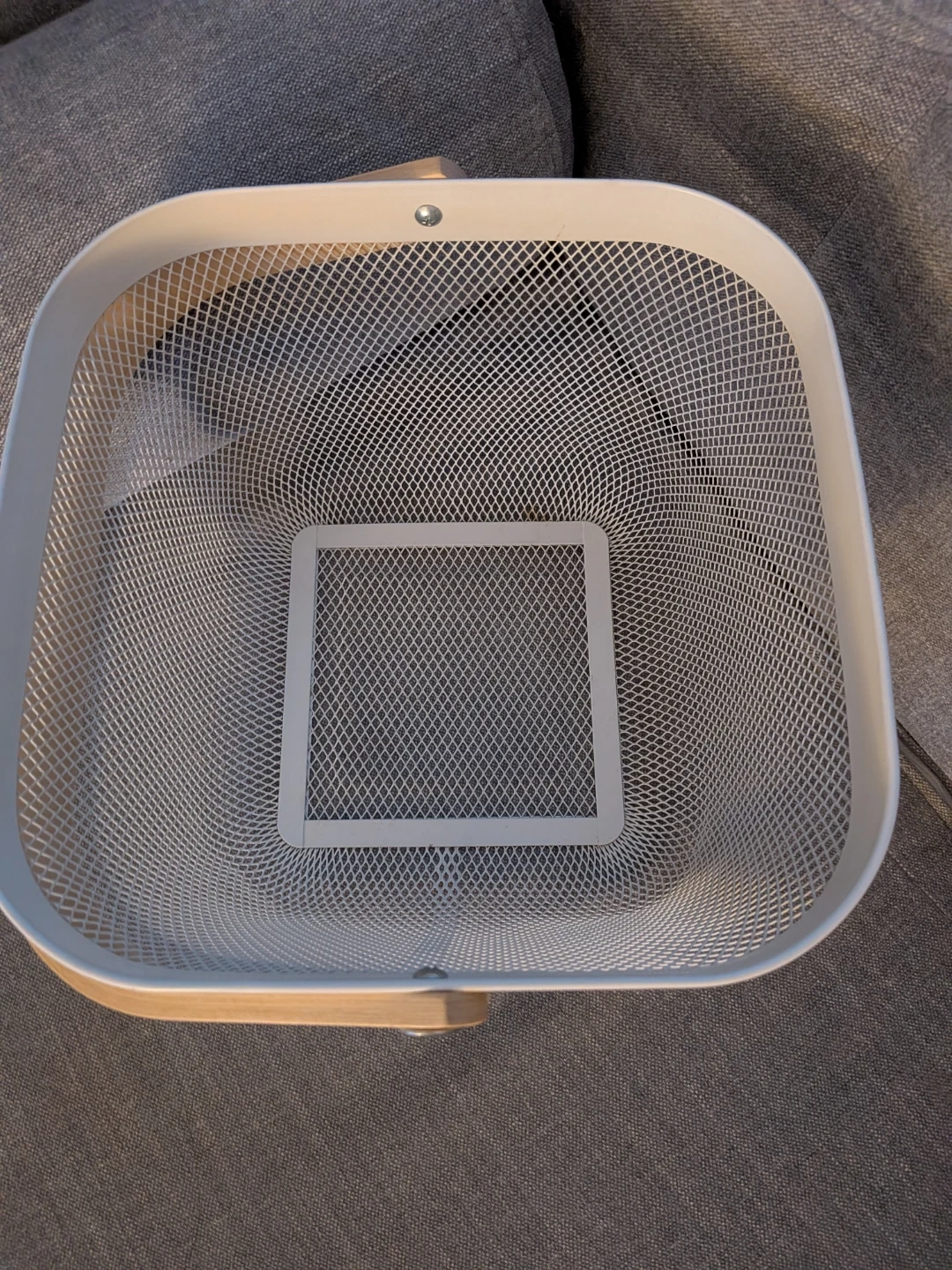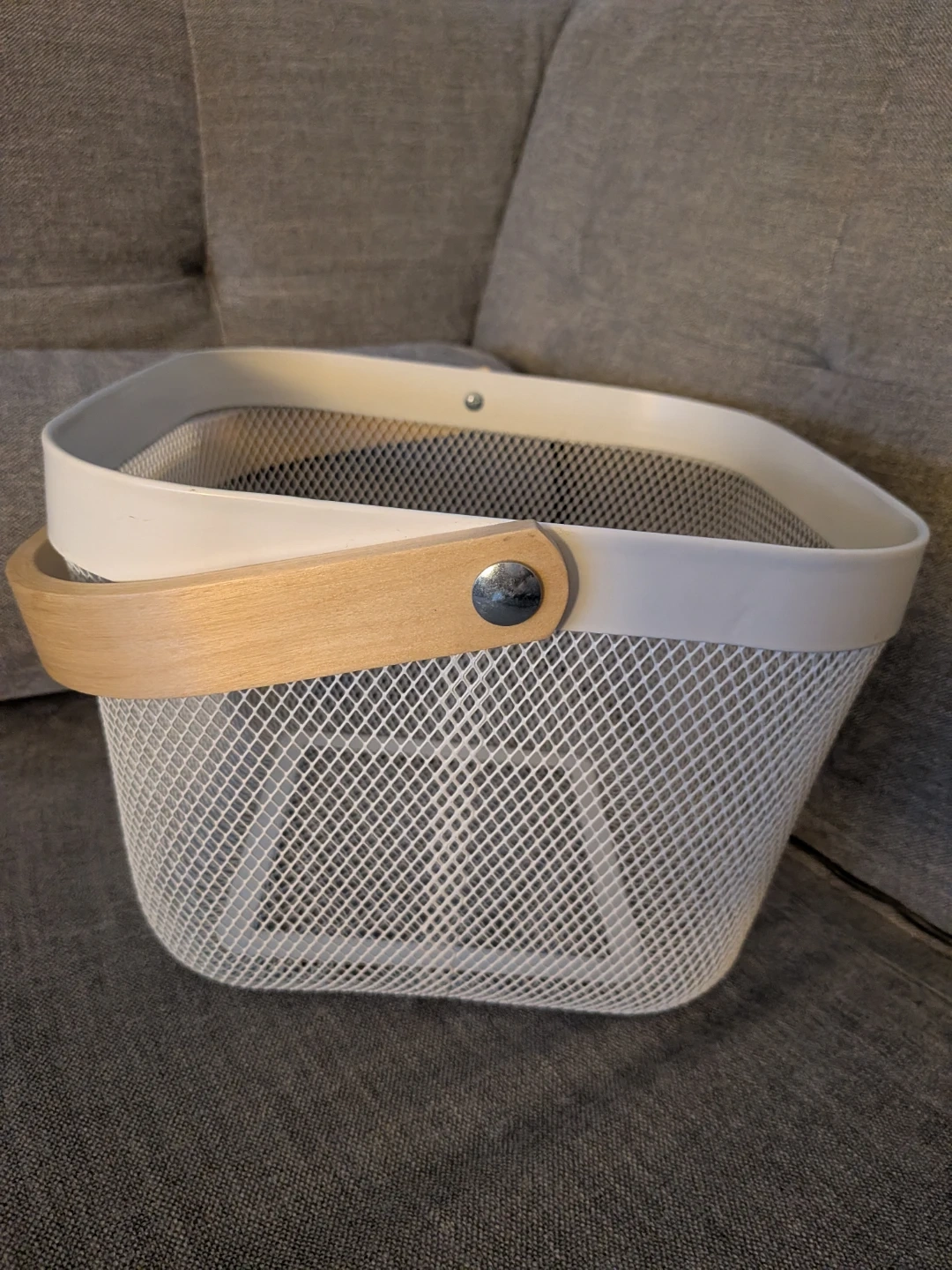 This white metal mesh basket features a sturdy wooden handle for easy carrying. It's a handy storage solution for various household items. Wire mesh construction allows for good ventilation.