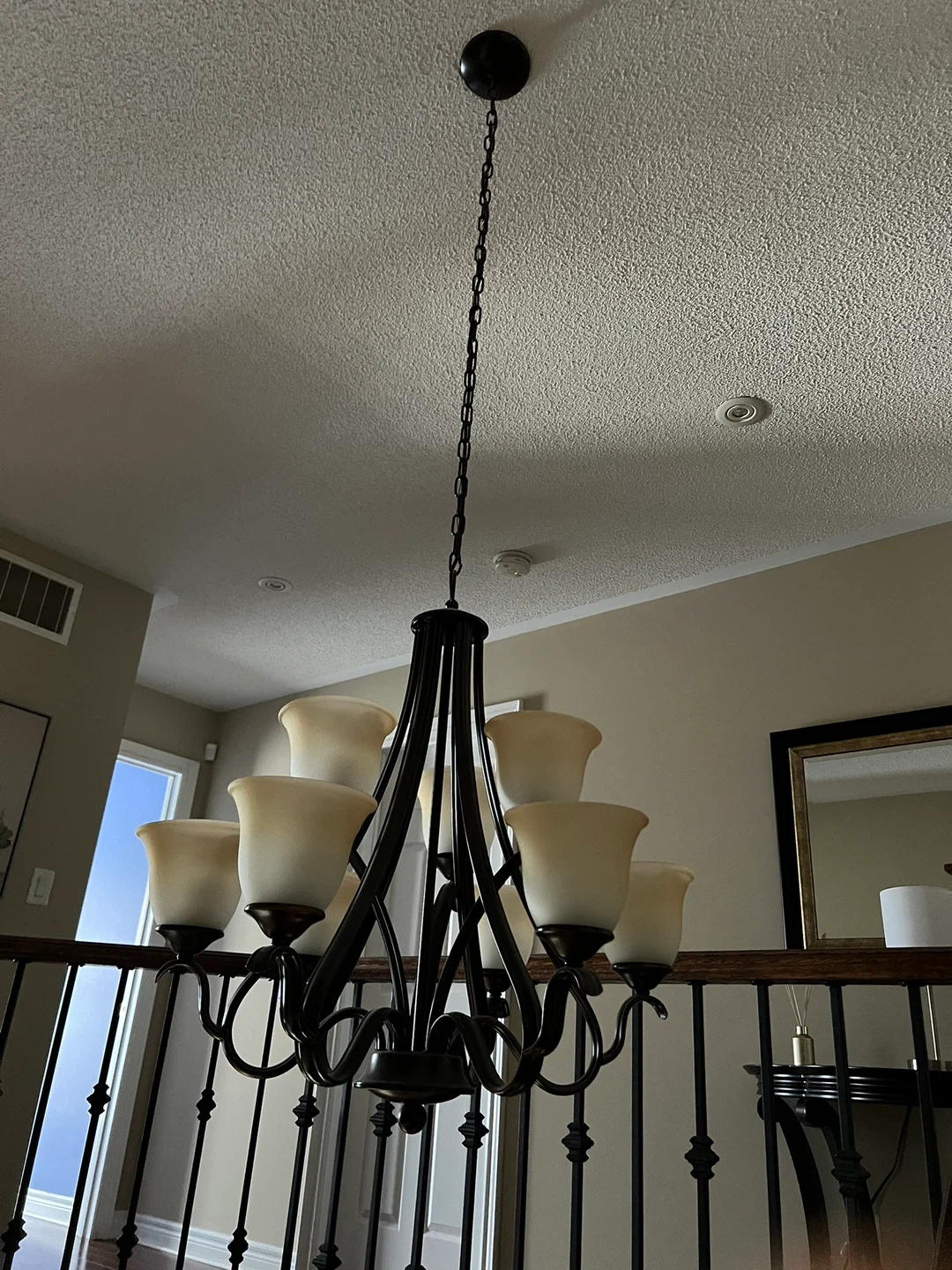 This chandelier provides ample lighting for your home. It features a dark bronze finish and comes with 8 frosted glass shades. Fixture is a great addition to any foyer or dining area.