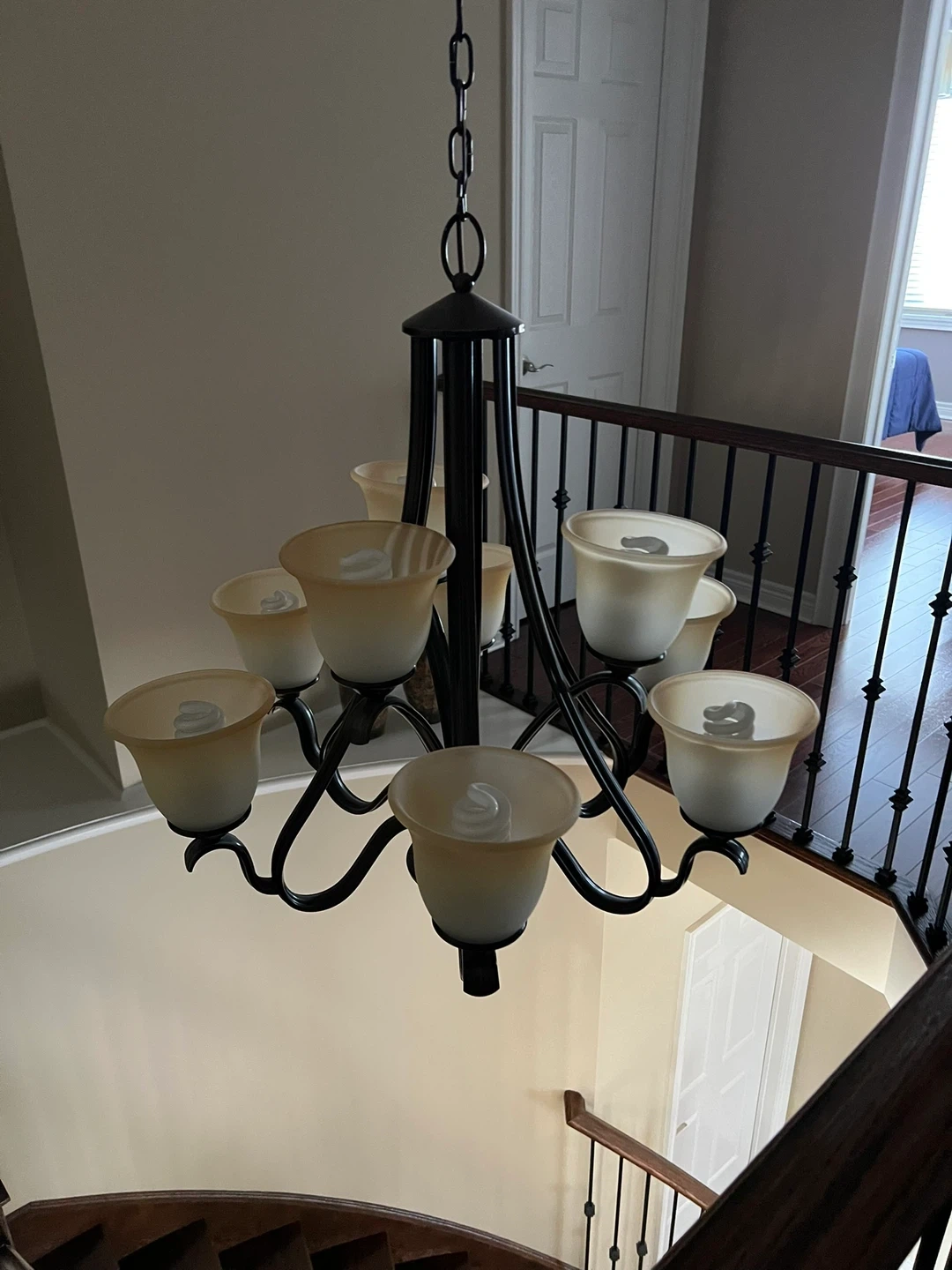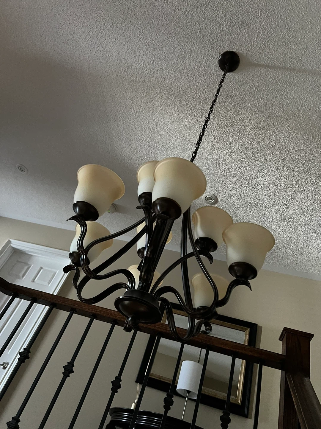 This chandelier provides ample lighting for your home. It features a dark bronze finish and comes with 8 frosted glass shades. Fixture is a great addition to any foyer or dining area.