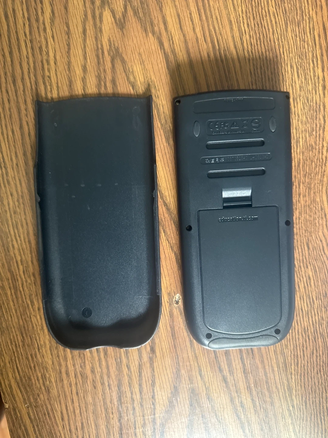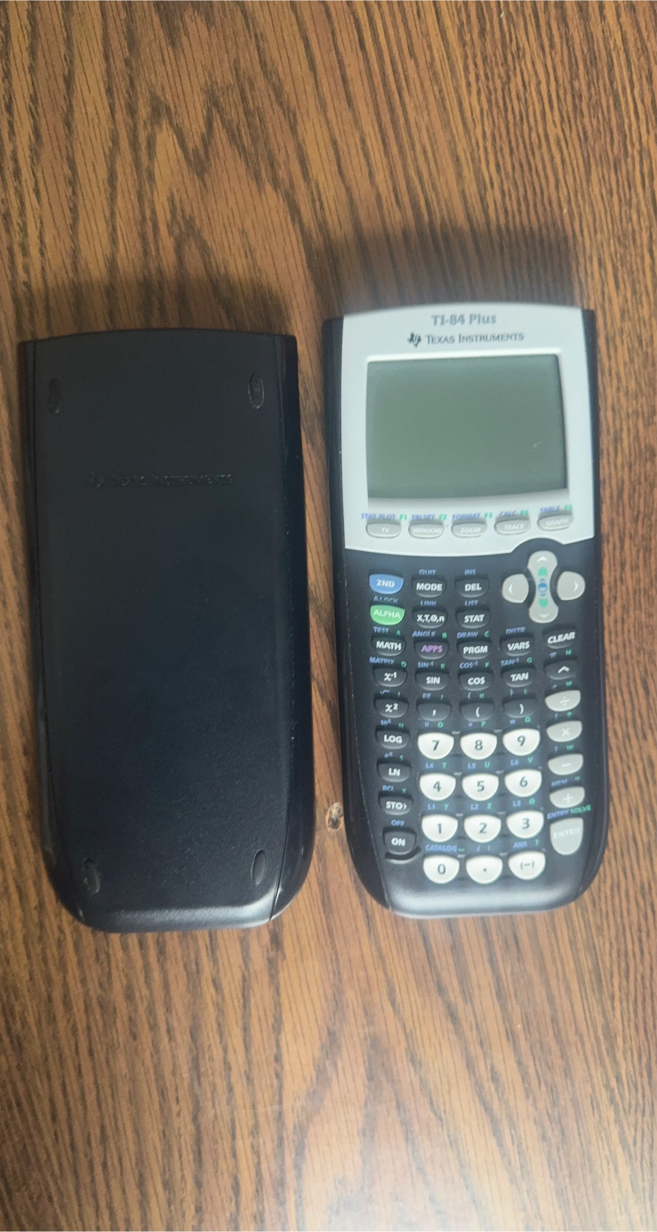 This is a Texas Instruments TI-84 Plus graphing calculator. It comes with its protective sliding cover. This calculator is commonly used for advanced math and science courses.