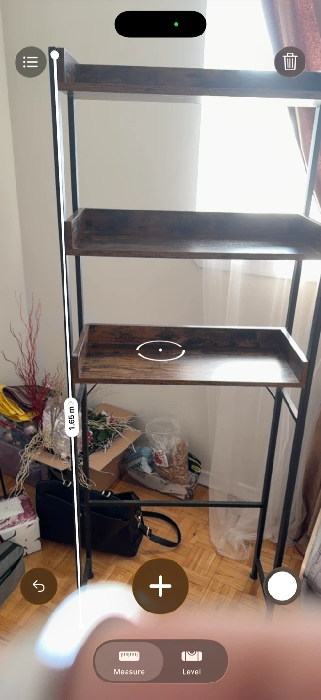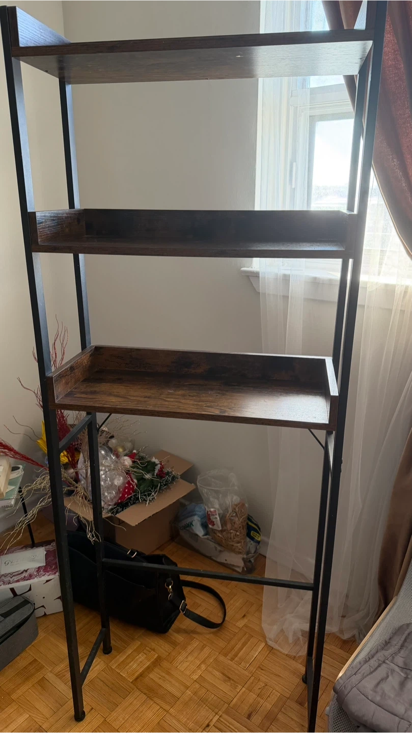 This is a rustic brown ladder shelf with a metal frame. It has three tiers for storage or display. It's a stylish and functional piece for any room!
