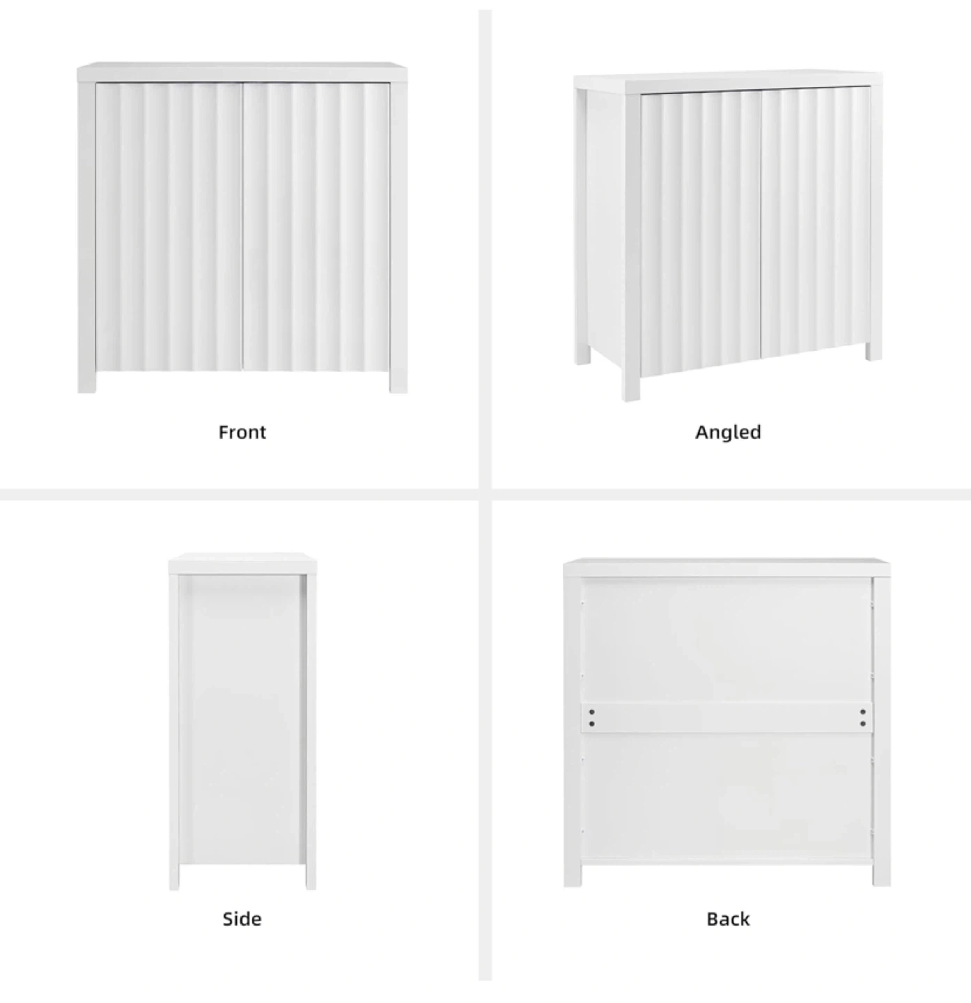This white Finnihomy side table has a modern design with fluted doors. It's made of MDF and features three shelves, each adjustable to three height options. The tabletop is thickened and the legs are widened for stability.