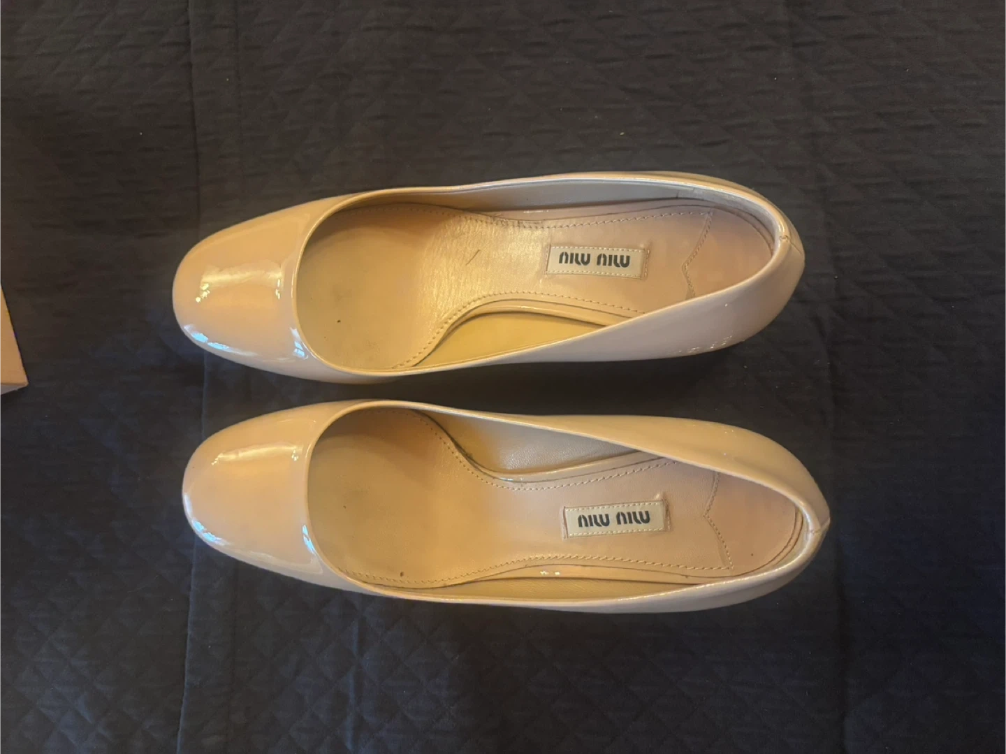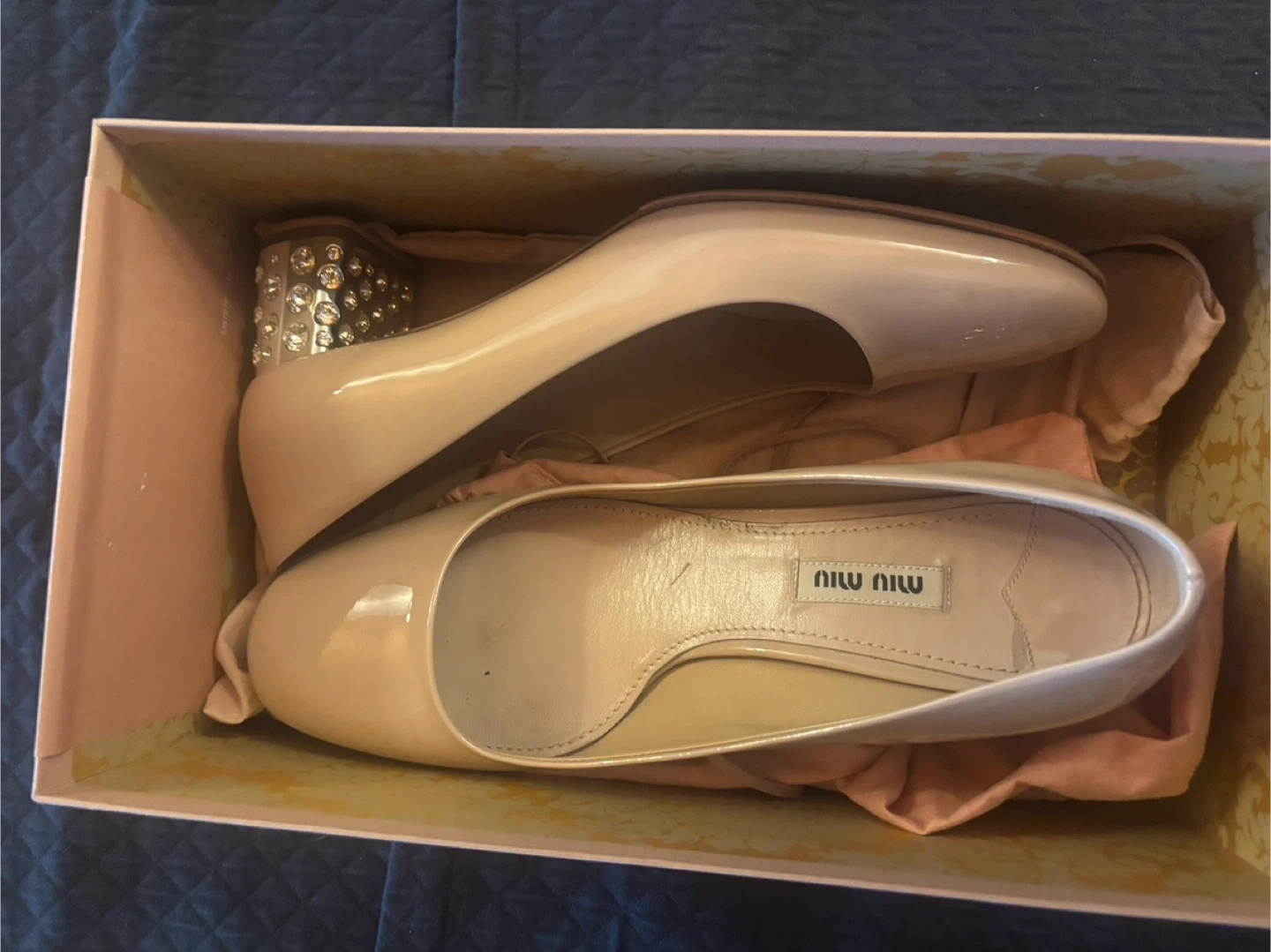 These Miu Miu pumps feature a patent leather finish and a unique heel embellished with sparkling crystals. They're a size 39 and come in their original box.