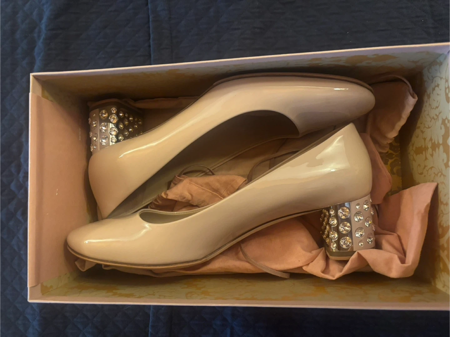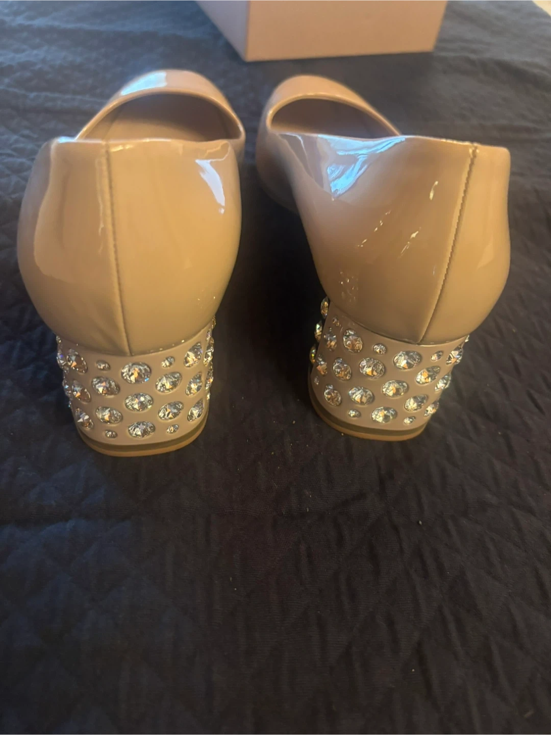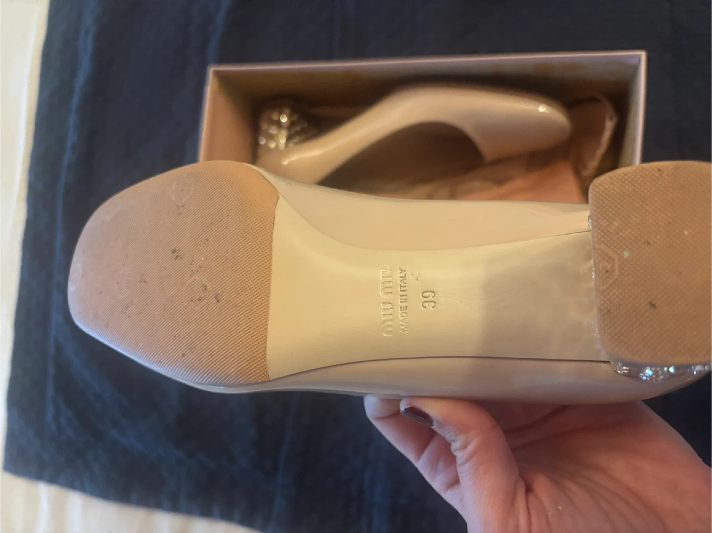 These Miu Miu pumps feature a patent leather finish and a unique heel embellished with sparkling crystals. They're a size 39 and come in their original box.
