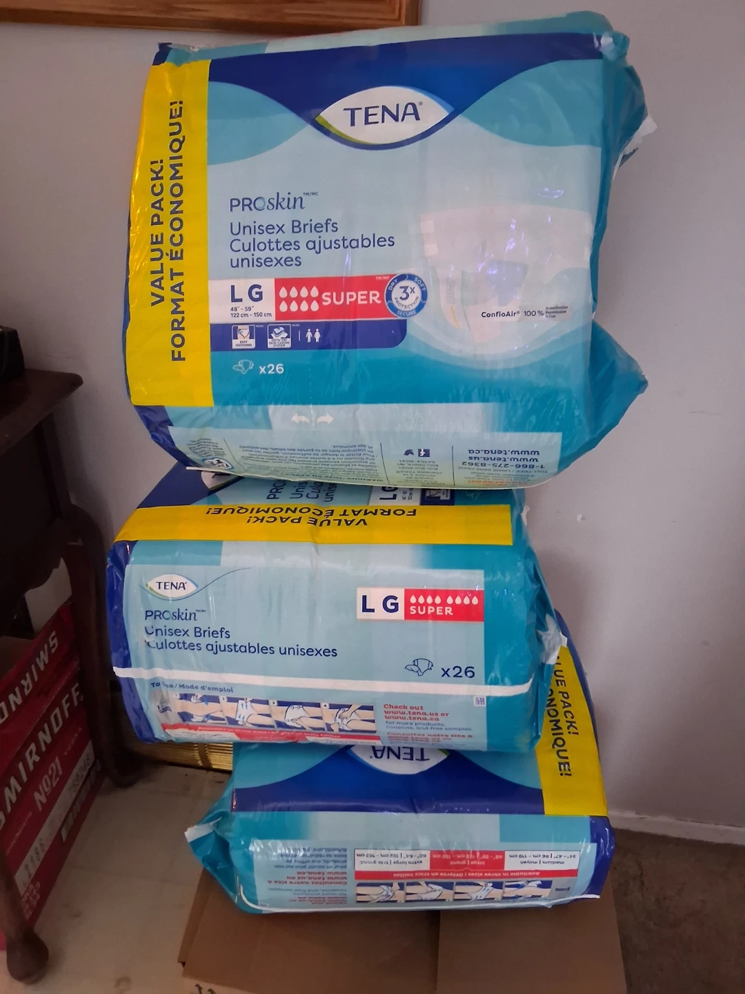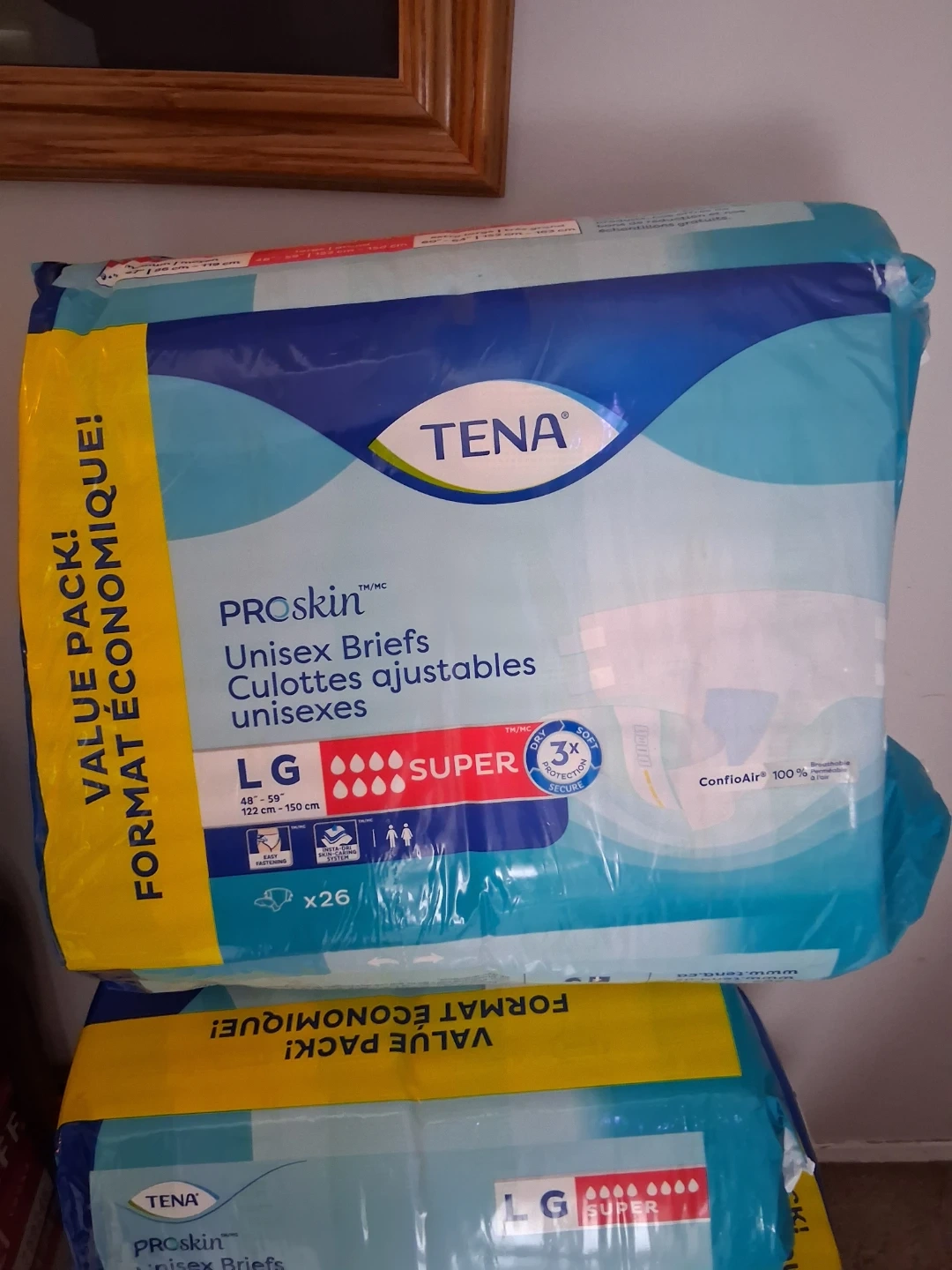This is a pack of three TENA ProSkin Unisex Briefs in size Large. They are designed for super absorbency and are a value pack for economical use. The briefs are made with ConfioAir 100% breathable technology. $120 for all 3 bags