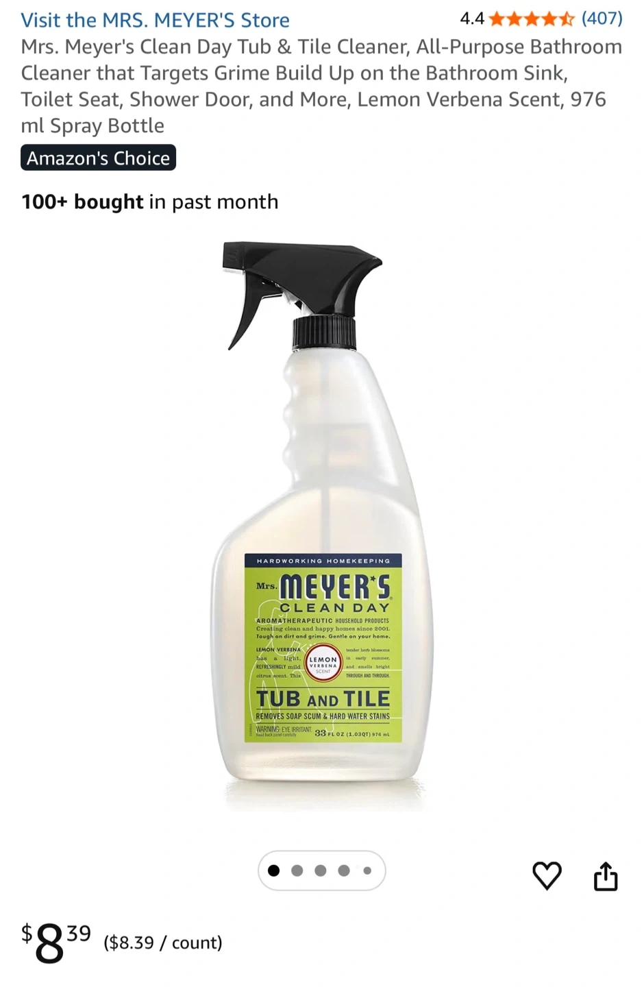 Mrs. Meyer's Clean Day Tub & Tile Cleaner targets grime build-up. It's an all-purpose bathroom cleaner with a Lemon Verbena scent. 976 ml spray bottle.