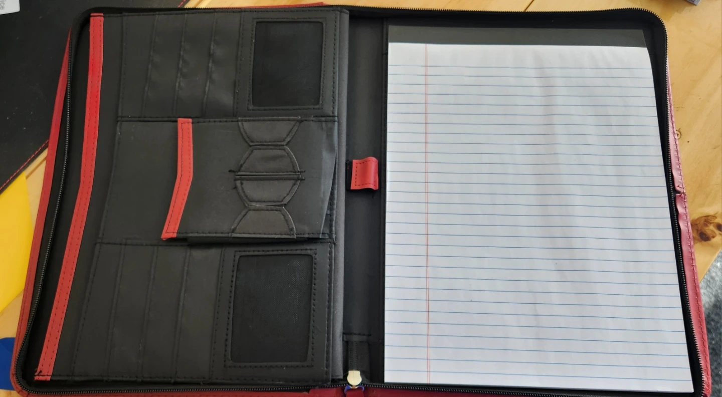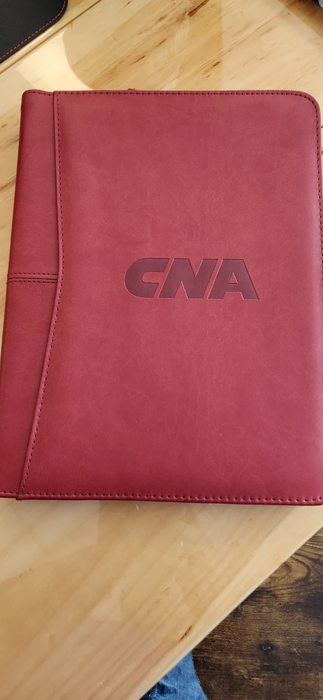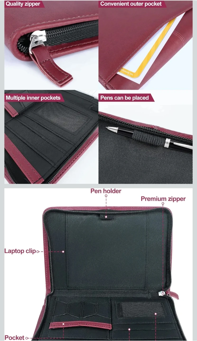 This burgundy portfolio organizer features multiple inner pockets and a convenient outer pocket. It includes a pen holder and a laptop clip. The premium zipper ensures secure closure for your documents and essentials. It's great for office or travel use!