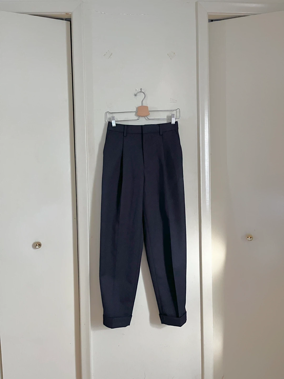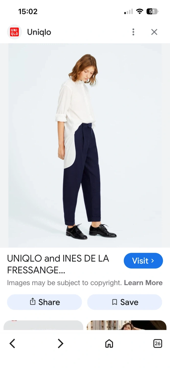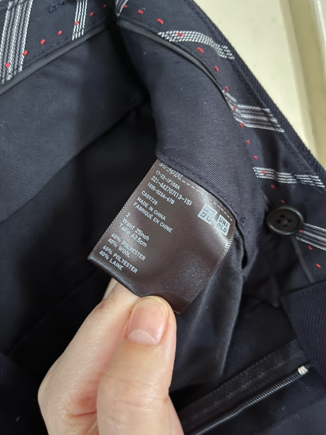 UNIQLO Ines de la Fressange Paris navy trousers. These pants are a blend of 40% wool, 40% polyester, and 20% rayon. They feature a 25-inch waist and a length of 33.5cm. Perfect for a smart casual look!